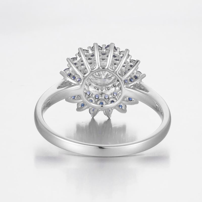 14Ct White Gold Ceylon Sapphire And Diamond Double Halo Ring Featuring Centre, One Round Brilliant Cut Diamond (0.39Ct, H Colour, Si1 Clarity), Claw Set, With 16 Round Brilliant Cut Diamonds (0.08Ct Tdw, G-H Colour, Si1-Si2 Clarity), Bead Set, And 48 Round Cut, Light-Dark Cornflower Blue Ceylon Sapphires (0.74Ct Tsw, Slight Inclusions), Claw Set. Ring Size O.