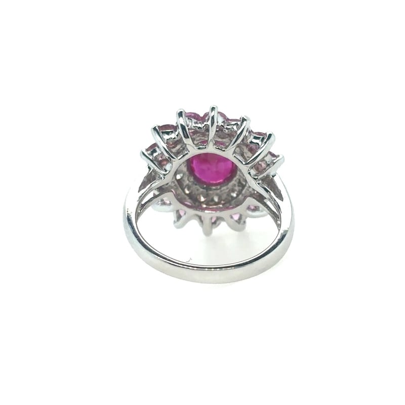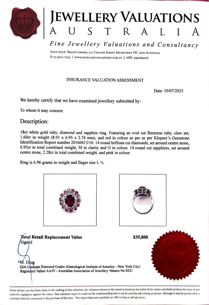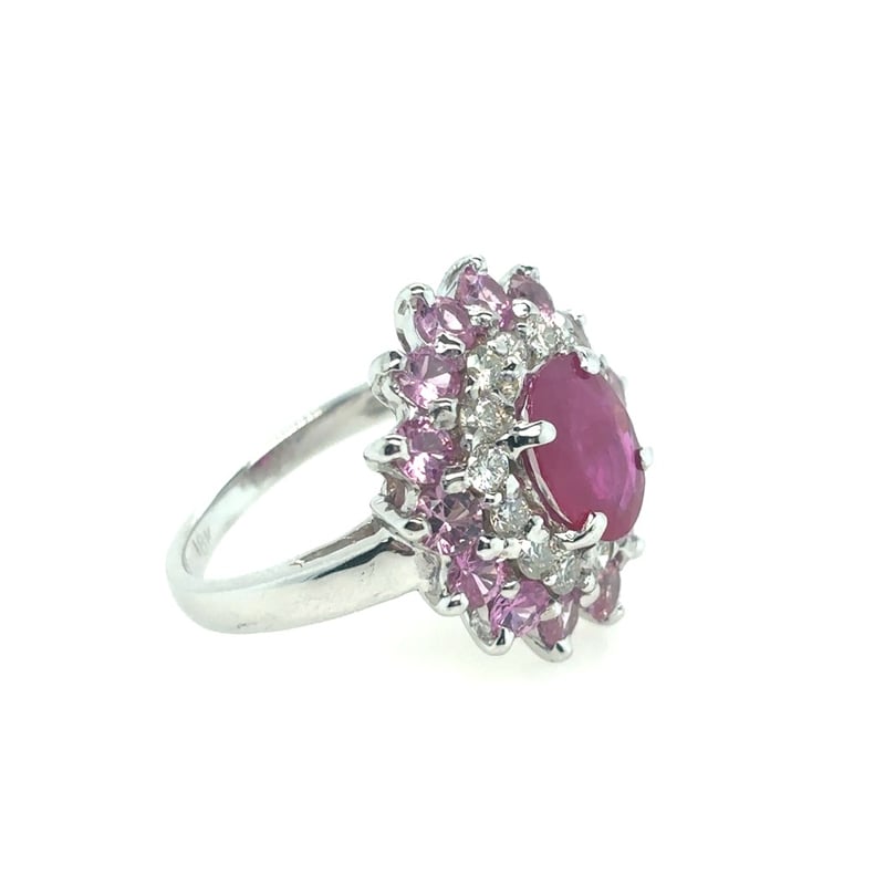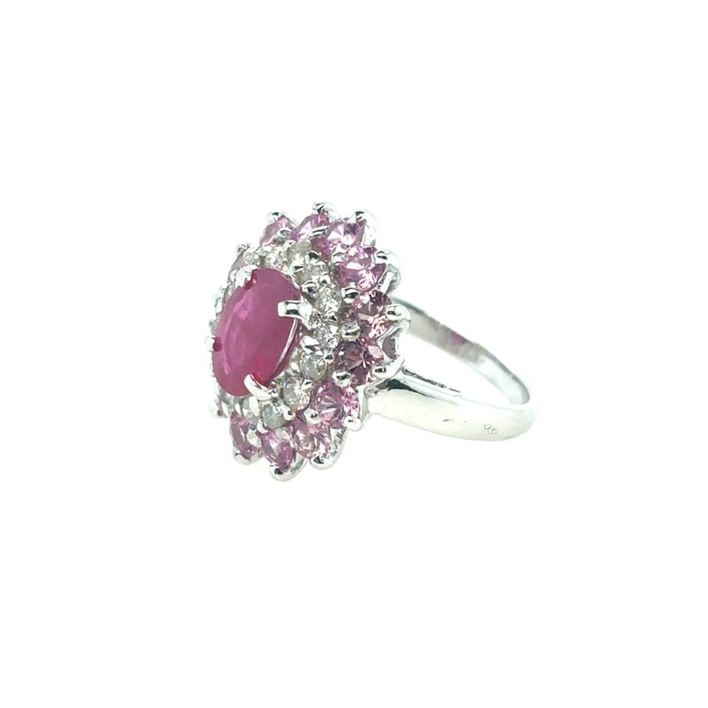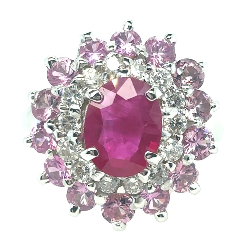 Featuring An Oval Cut Burmese Ruby, Claw Set, 1.60Ct In Weight (8.91 X 6.95 X 2.74 Mm), And Red In Colour As Per As Per Klepner'S Gemstone Identification Report Number 20160413/10. 14 Round Brilliant Cut Diamonds, Set Around Centre Stone, 0.95Ct In Total Combined Weight, Si In Clarity And G In Colour. 14 Round Cut Sapphires, Set Around Centre Stone, 2.28Ct In Total Combined Weight, And Pink In Colour. Finger Size L 1/2