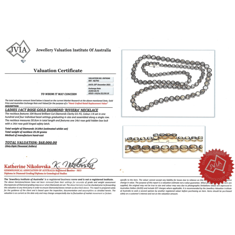 The Design Features, 104 Round Brilliant Cut, Diamonds (14.64Ct Tdw, J-N Colour, Si1-P2 Clarity), Bezel Set. Necklace Has Box Clasp And Safety Latch. Necklace Length Is 50Cm.