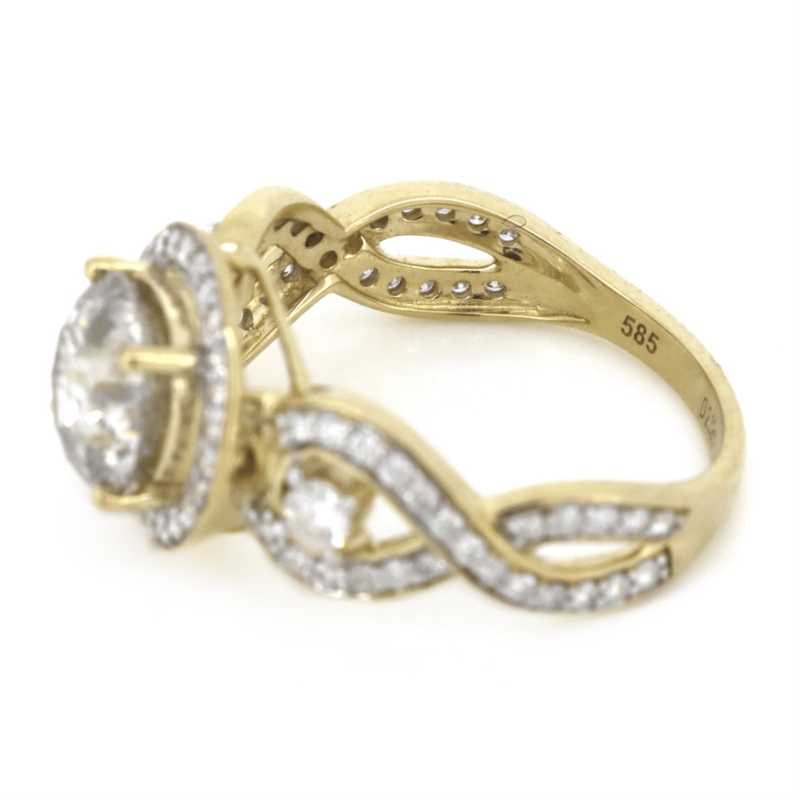 14K YELLOW GOLD AND DIAMOND, HALO TRILOGY RING.