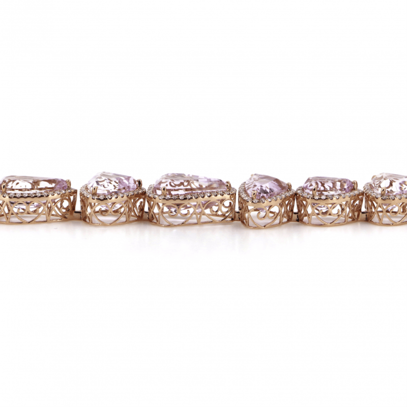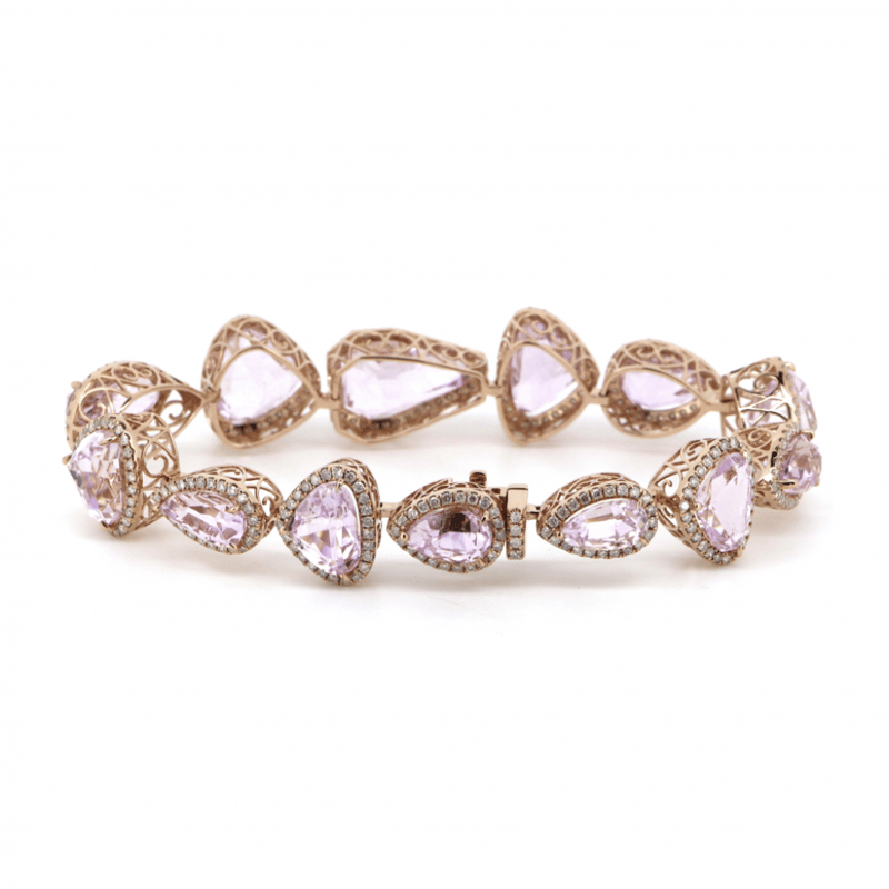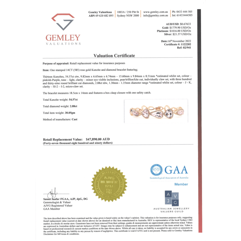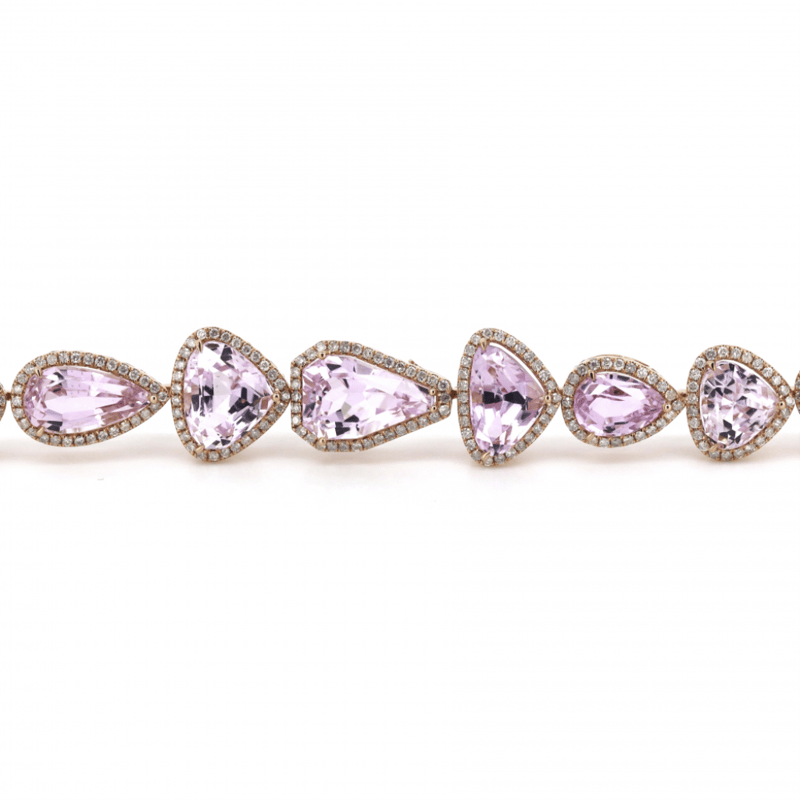14K ROSE GOLD, KUNZITE AND DIAMOND, HALO BRACELET. The Central Design Features, 13 Pear, Trillion And Kite Cut, Light Pinkish-Purple, Kunzites (54.57Ct Tsw, Minor Eye Visible Inclusions), Claw Set. Surrounding The Centres In Halos Are, 339 Round Brilliant Cut, Diamonds (2.88Ct Tdw, J-K Colour, Si2-I2 Clarity), Micro-Claw Set. The Bracelet Has A Box Lock Clasp, With One Safety Latch. Bracelet Length Is 18.5Cm. Valuations Provided by an Independent Third-Party Professional Not Directly Associated With Lloyds Auctions at AUD $$47,890.00This valuation has been conducted by an independent third-party professional. The valuation amount is an assessment by the issuing valuer and does not reflect the auction value of the item. Any inquiries regarding the valuation should be directed to the issuing valuer (refer to contact details on the certificate), as Lloyds Auctions has no affiliation or influence over the valuation, the valuer, or the stated amount. Condition: Good - Refer Images 0+5250