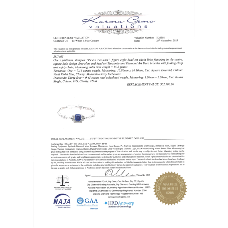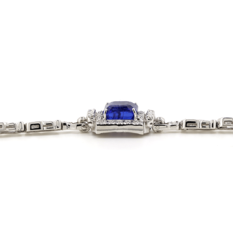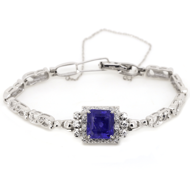 The Centre Features, One Square Emerald Cut, Tanzanite (7.16Ct, Moderate-Heavy Inclusions), Claw Set. Encompassing The Design Are, 34 Round Single Cut, Diamonds (0.45Ct Tdw, F-G Colour, Vs-Si Clarity), Bead/Bezel And Pip Claw Set. The Bracelet Features Fold-Over Clasp.