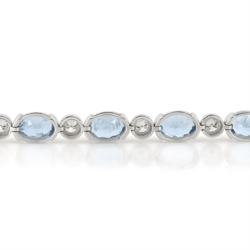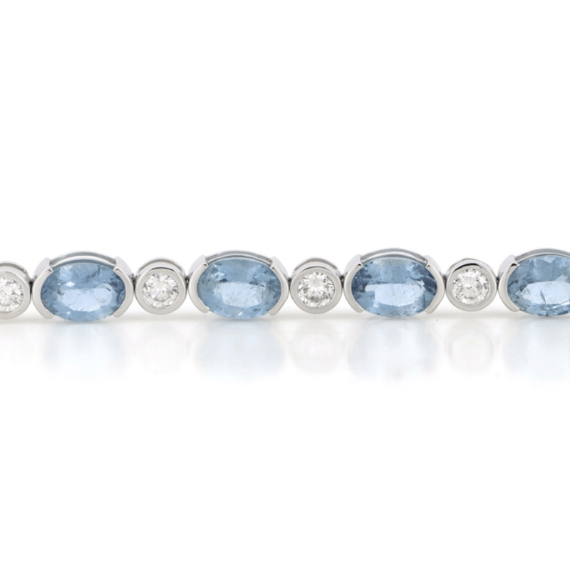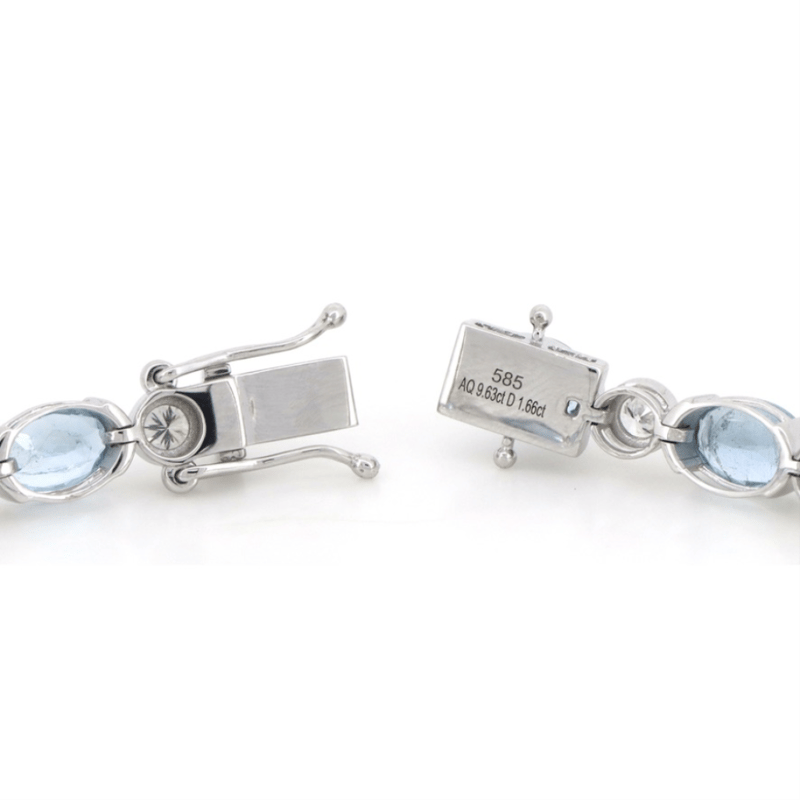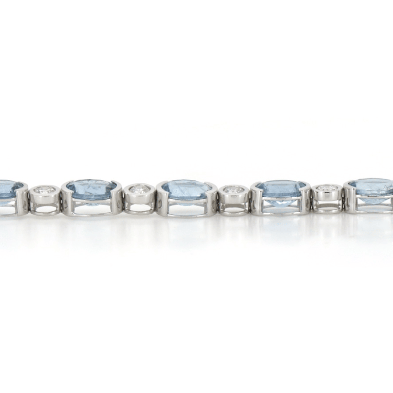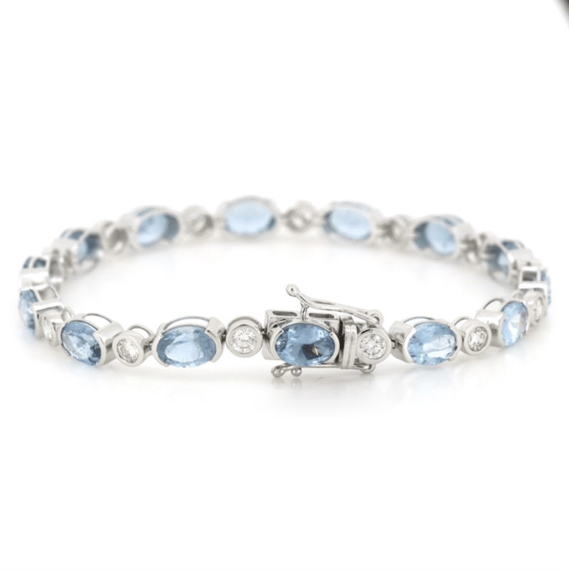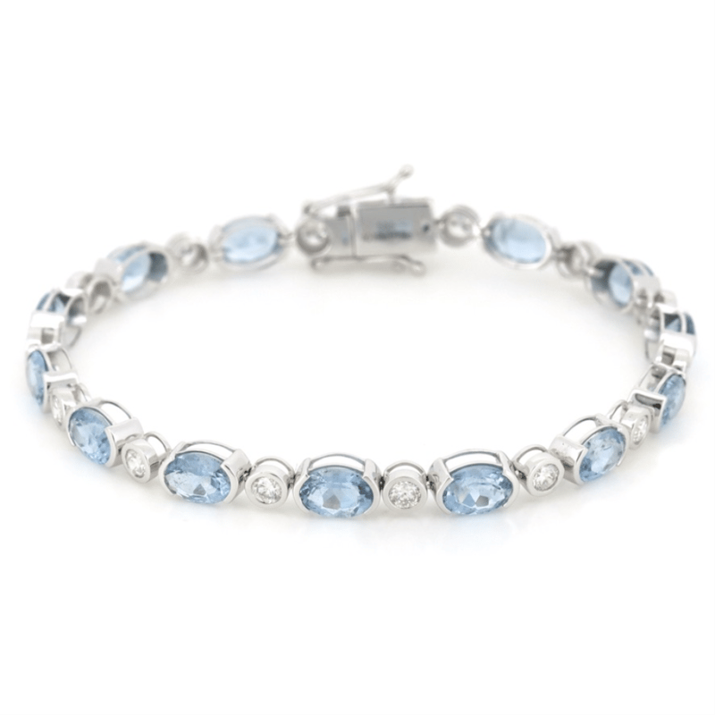 The Design Features, 14 Oval Cut, Santa Maria Blue, Aquamarines (9.63Ct Tsw, Light-Moderate Inclusions), Semi-Bezel Set. Alternating Between Are, 14 Round Brilliant Cut, Diamonds (1.66Ct Tdw, G-J Colour, Si Clarity,), Bezel Set. The Bracelet Features A Box Snap Clasp. Bracelet Length Is 18Cm.