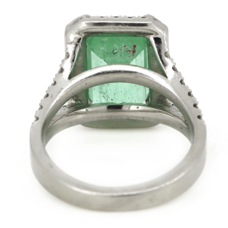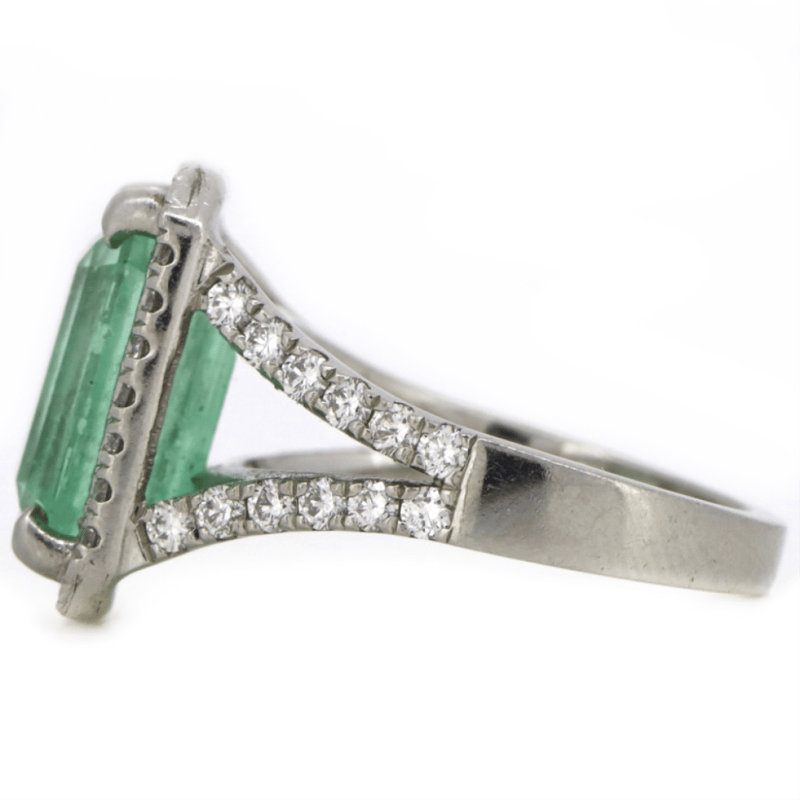 The Centre Features, One Rectangle Emerald Cut, Moderate Green, Colombian Emerald (3.29Ct, Moderately Included), Claw Set. Encompassing The Design And Decorating The Band, 58 Round Brilliant Cut, Diamonds (0.66Ct Tdw, F-G Colour, Vs1-Vs2 Clarity), Micro-Bead Set. Ring Size I.