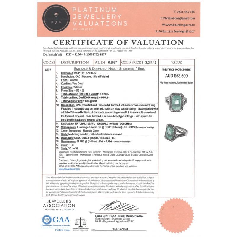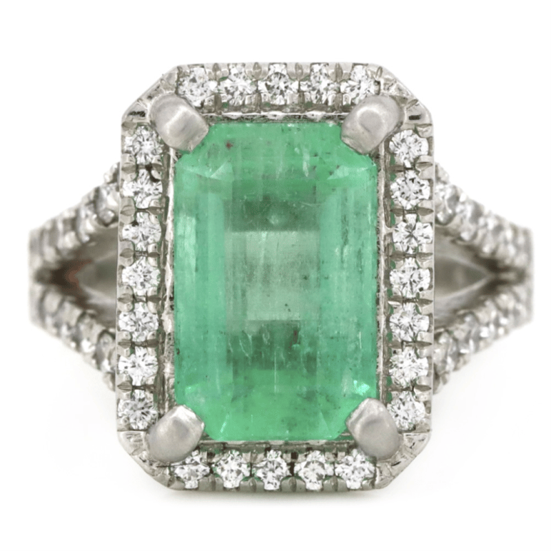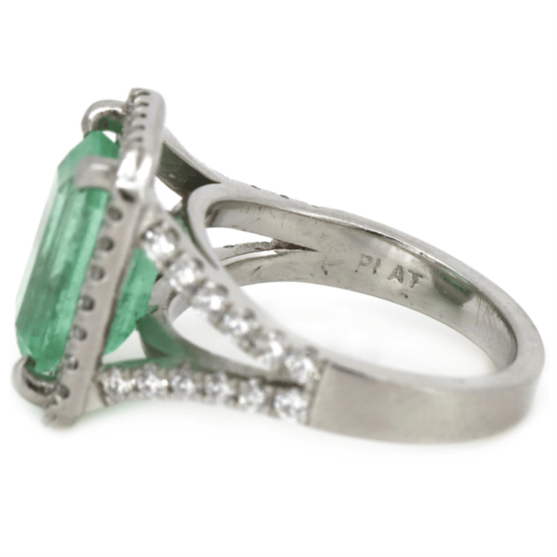 950 PLATINUM, 3.29CT COLOMBIAN EMERALD AND DIAMOND, HALO SPLIT BAND RING.