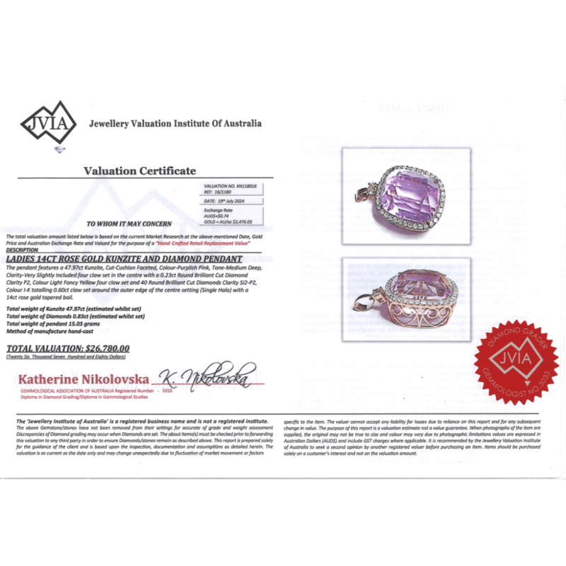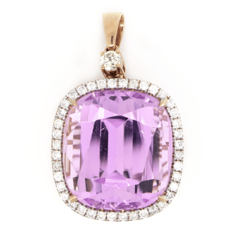 The Centre Features, One Cushion Faceted Cut, Medium Deep Purplish-Pink, Kunzite (47.97Ct, Very Slightly Included), Claw Set. Encompassing In The Bail Is, One Round Brilliant Cut, Light Fancy Yellow, Diamond (0.23Ct Tdw, P2 Clarity), 4-Claw Set. Surrounding The Centre In A Halo Are, 40 Round Brilliant Cut, Diamonds (0.60Ct Tdw, I-K Colour, Si2-P2 Clarity), Claw Set.