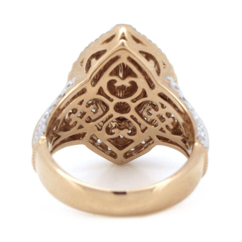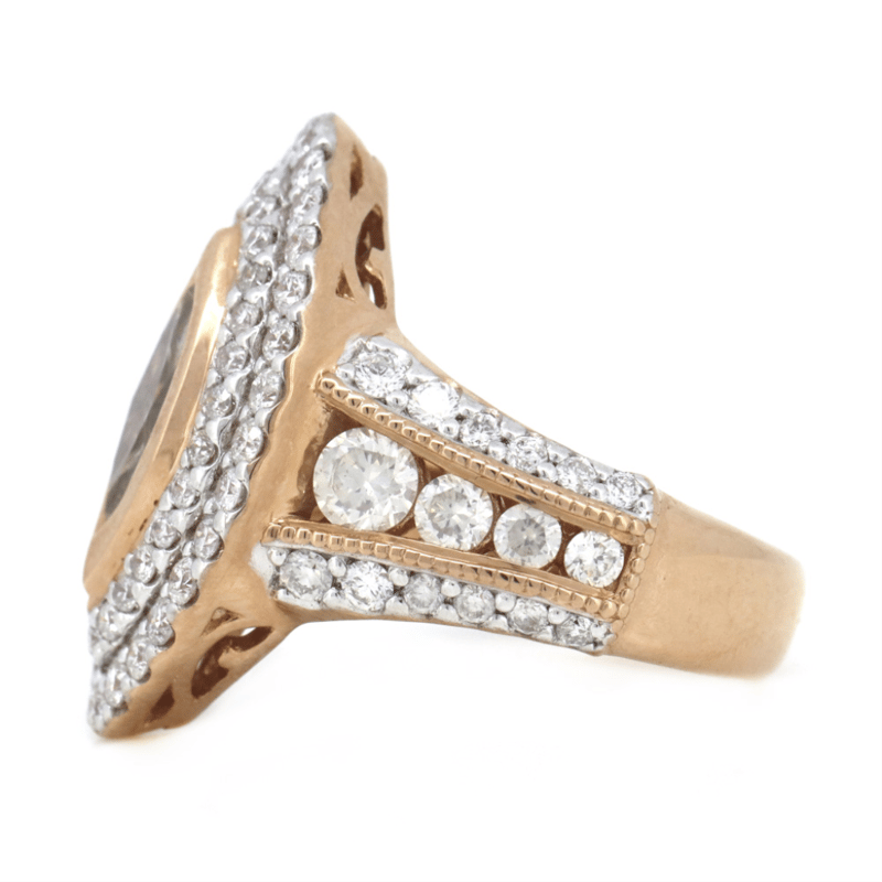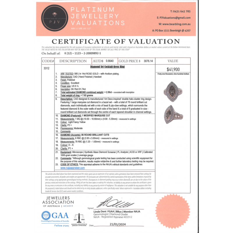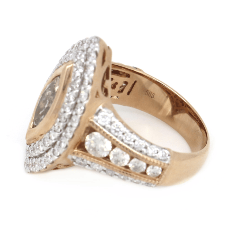 The Centre Features, Modified Marquise Cut, Light Fancy Yellow, Diamond (0.76Ct, P2+ Clarity), Bezel Set. Encompassing The Design Are, 86 Round Brilliant Cut, Diamonds (1.74Ct Tdw, H-K Colour, P1+ Clarity), Bead/Pip-Claw Set. Ring Size M 1/2.