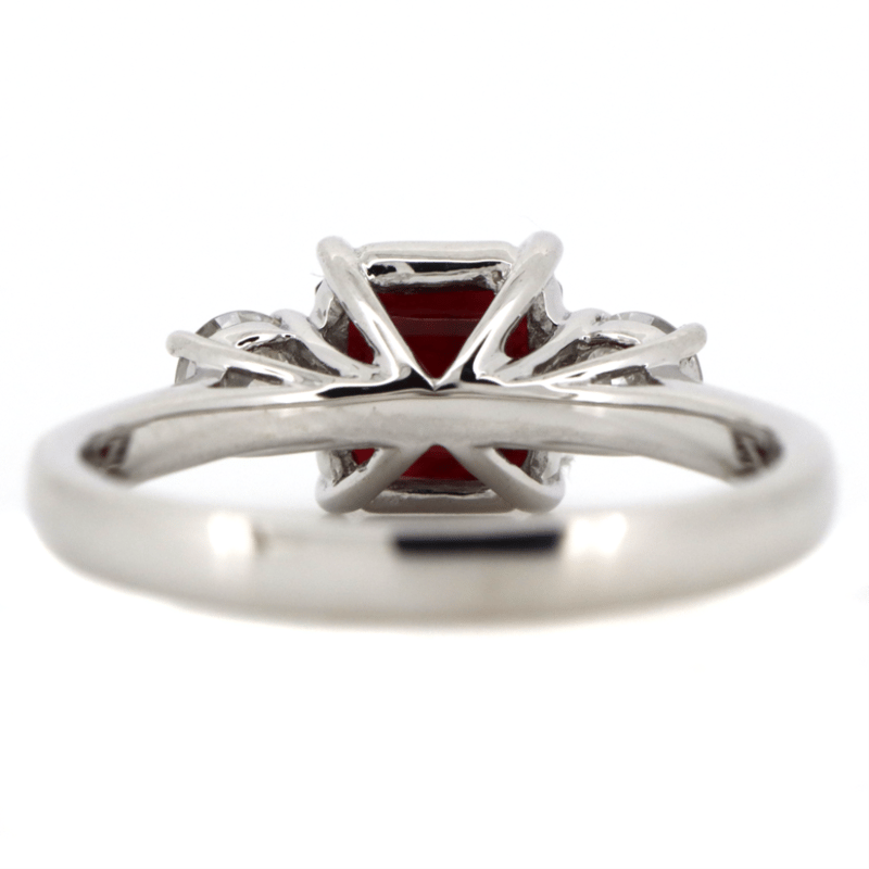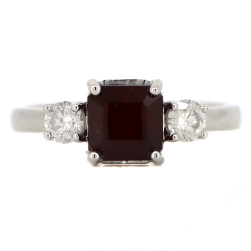 The Centre Design Features, One Square Cut, Ruby (1.81Ct, Moderate-Heavy Inclusions), Claw Set. Decorating On Either Side Of Centre Are, 2 Round Brilliant Cut, Diamonds (0.34Ct Tdw, H-I Colour, I1-2 Clarity), Claw Set. Ring Size M.