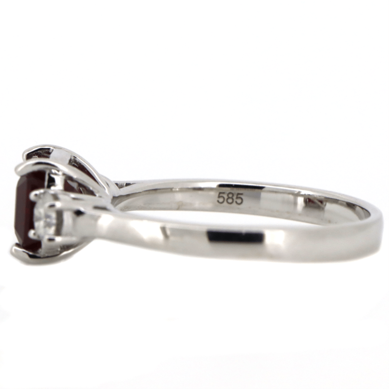 14K WHITE GOLD, RUBY AND DIAMOND, TRILOGY RING.