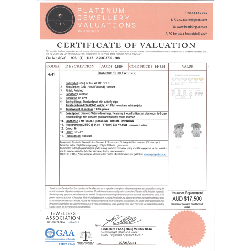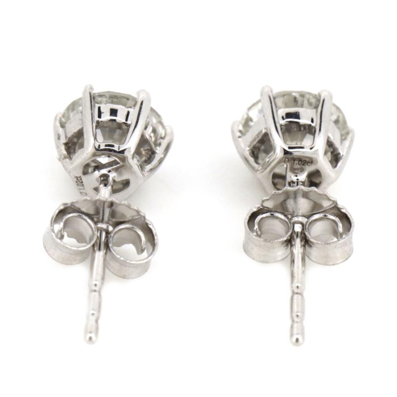 The Centres Feature, 2 Round Brilliant Cut, Diamonds (1.02Ct Tdw, H-I Colour, Si2-P1 Clarity), 6 Claw Set. The Earrings Have Post Backs With 14K White Gold Butterfly Clasps.