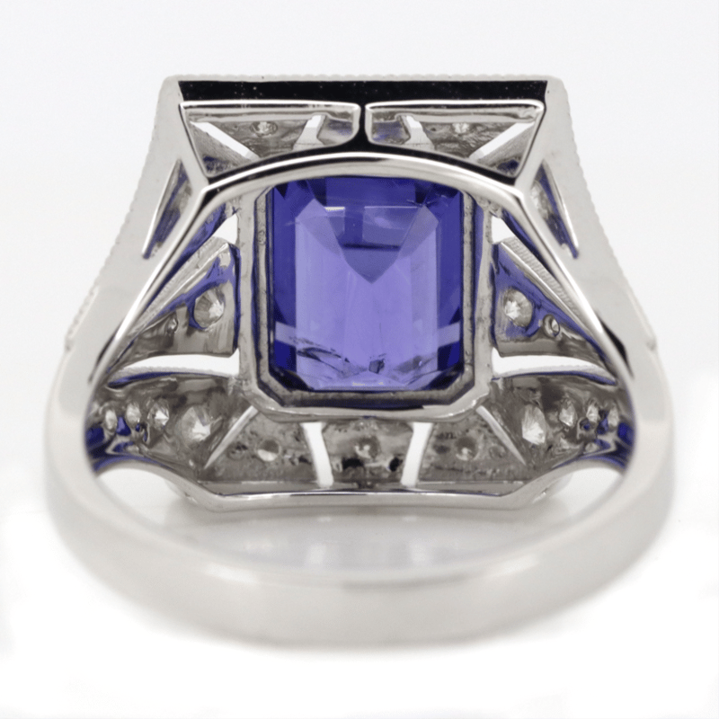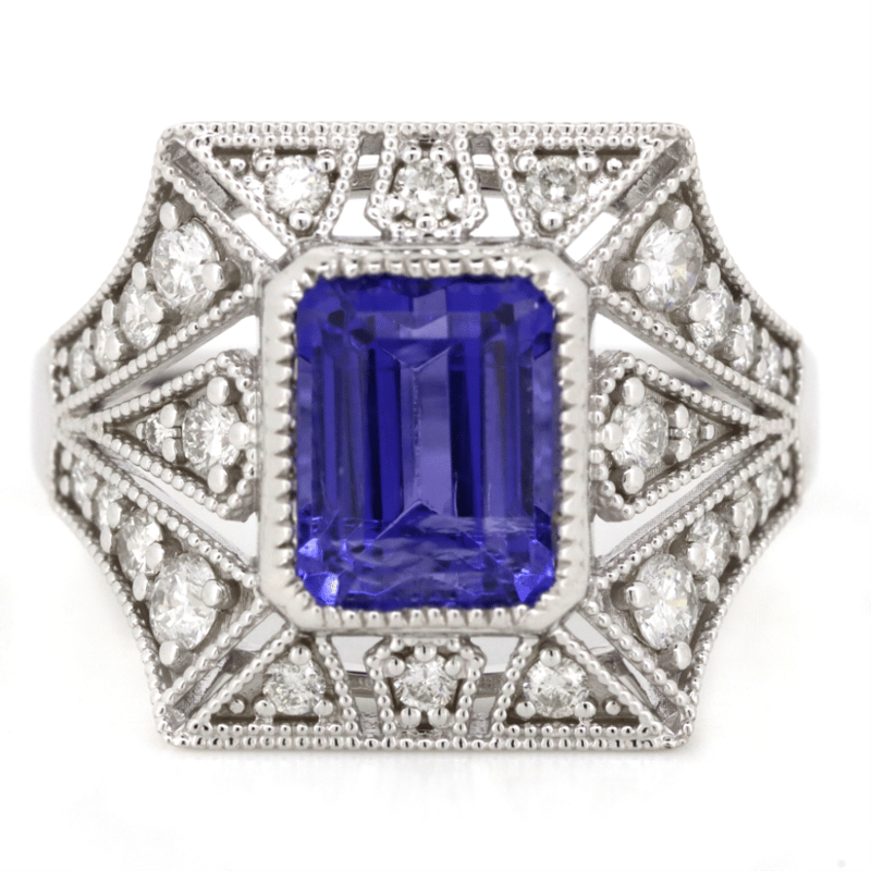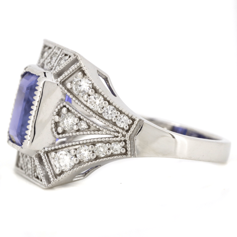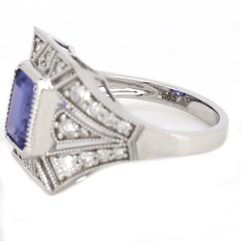 14K WHITE GOLD, TANZANITE AND DIAMOND, ART DECO INSPIRED RING.
