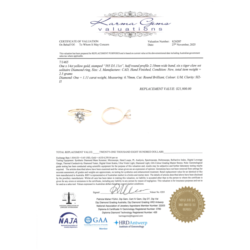 The Centre Features, One Round Brilliant Cut, Diamond (1.11Ct Tdw, L-M Colour, I1 Clarity), 6 Claw Set. Ring Size J.
