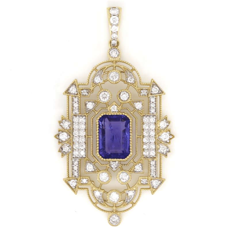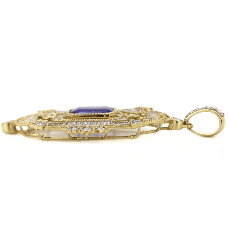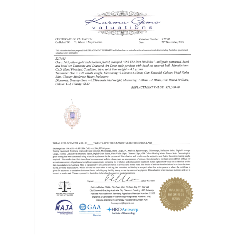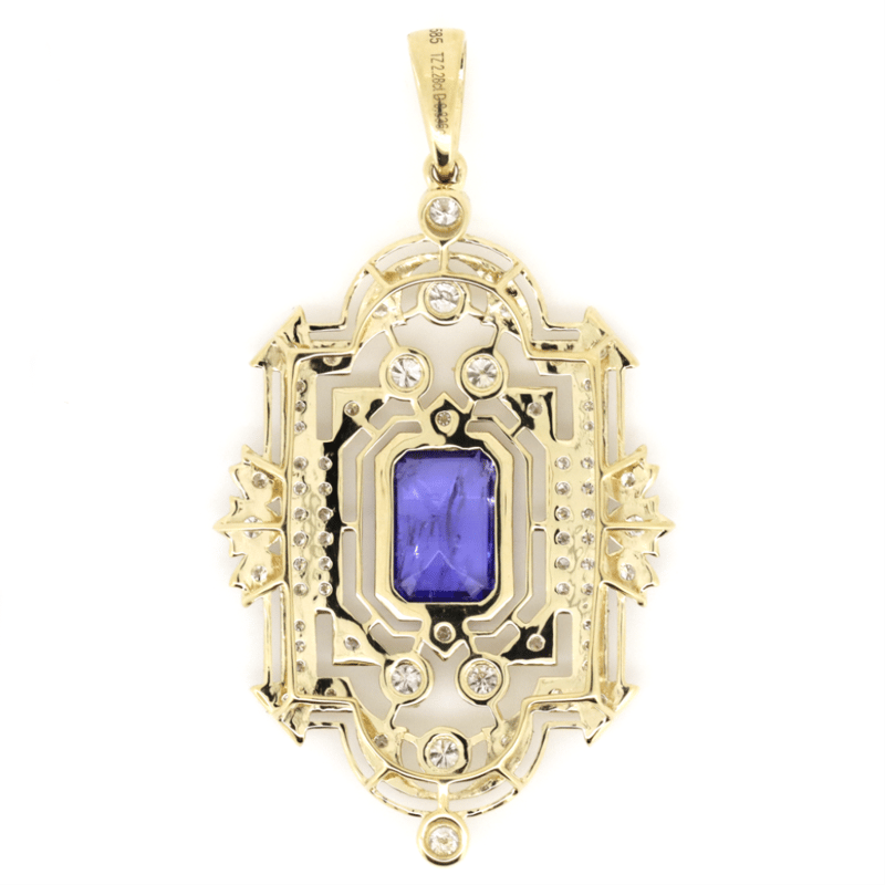 14K YELLOW GOLD, TANZANITE AND DIAMOND, ART DECO INSPIRED PENDANT. The Centre Features, One Emerald Cut, Tanzanite (2.28Ct, Moderate-Heavy Inclusions), Bezel Set. Encompassing The Centre And Decorating The Pendant Are, 73 Round Brilliant Cut, Diamond (0.836Ct Tdw, G-J Colour, Si-I2 Clarity), Bead Set. Valuations Provided by an Independent Third-Party Professional Not Directly Associated With Lloyds Auctions at AUD $$21,500.00This valuation has been conducted by an independent third-party professional. The valuation amount is an assessment by the issuing valuer and does not reflect the auction value of the item. Any inquiries regarding the valuation should be directed to the issuing valuer (refer to contact details on the certificate), as Lloyds Auctions has no affiliation or influence over the valuation, the valuer, or the stated amount. Condition: Good - Refer Images 0+5205