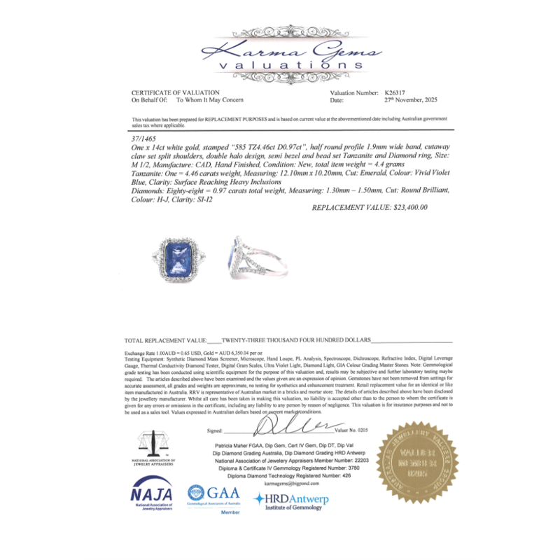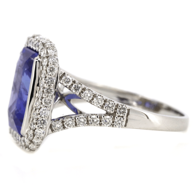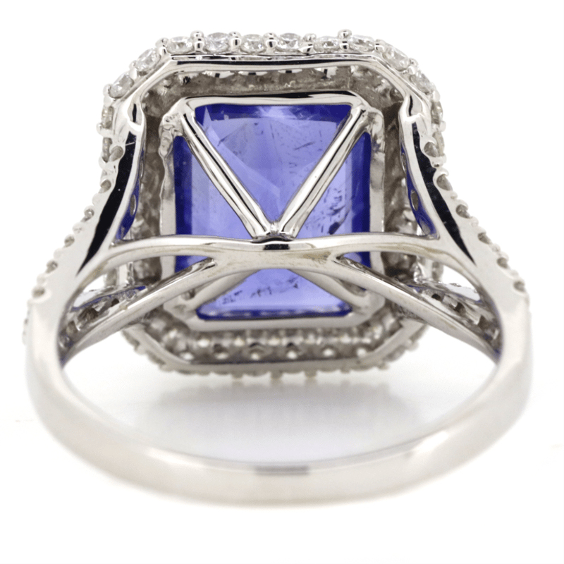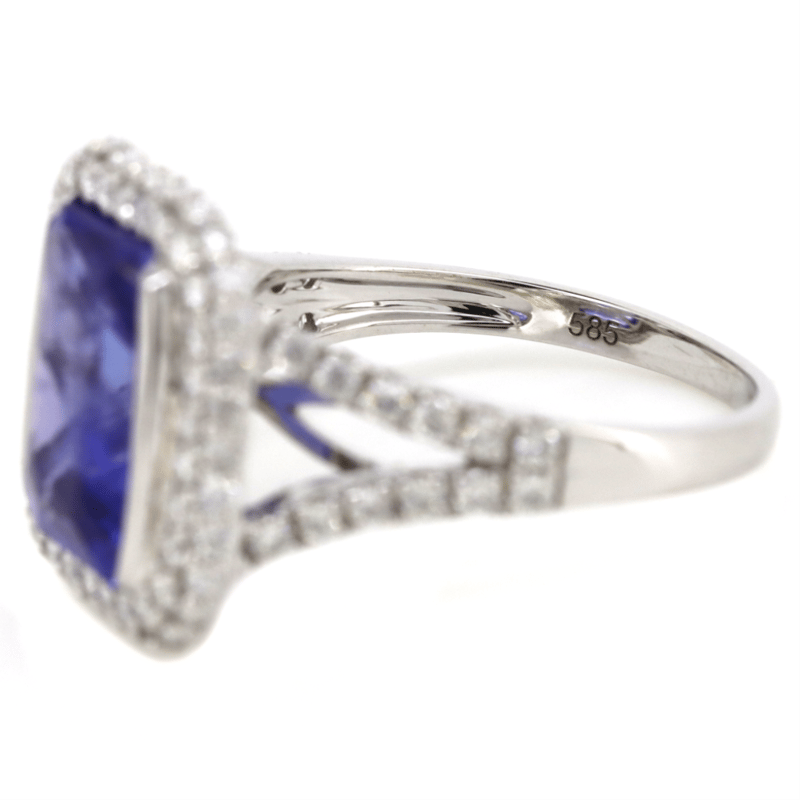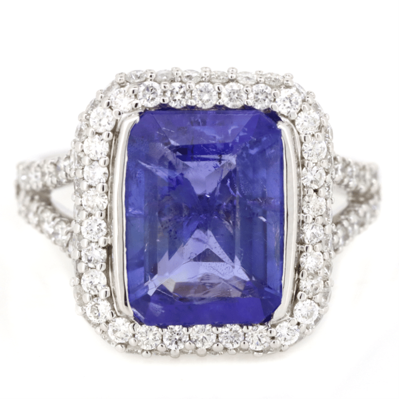 The Centre Features, One Emerald Cut, Tanzanite (4.46Ct, Surface Reaching Heavy Inclusions), 4 Claw Set In White Gold. Surrounding The Centre In A Halo And Decorating The Split Band Are, 88 Round Brilliant Cut, Diamonds (0.97Ct Tdw, H-J Colour, Si-I2 Clarity), Bead Set In White Gold.
