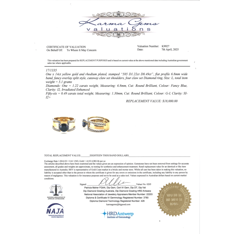 The Centre Features, One Round Brilliant Cut, Fancy Blue, Diamond (1.22Ct, I2 Clarity), Claw Set. Decorating The Band Are, 56 Round Brilliant Cut, Diamonds (0.49Ct Tdw, G-I Colour, I2 Clarity), Claw Set. Ring Size M.