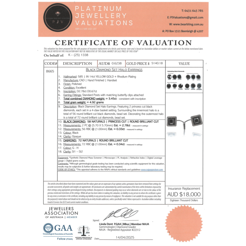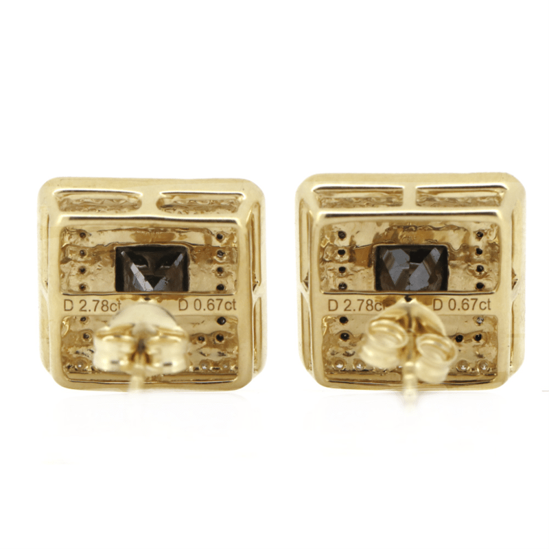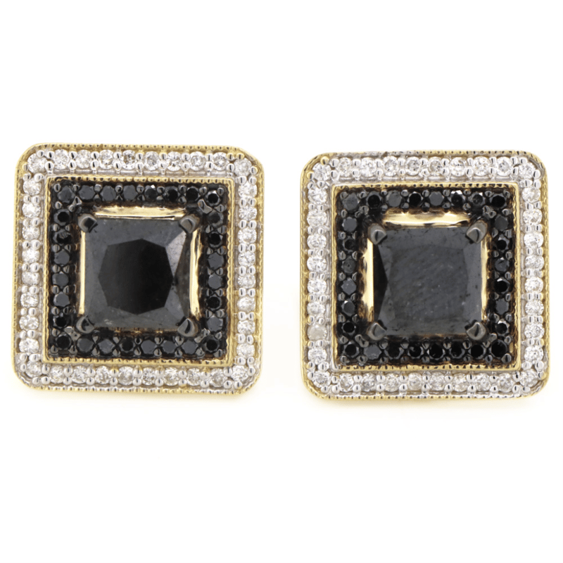 The Design Features, 2 Princess Cut, Black Diamond (2.78Ct Tdw, Opaque), Set In 4 Claw Basket Setting. Surrounding The Inner Halo Are, 56 Round Brilliant Cut, Black Diamonds (0.33Ct Tdw, Opaque), Bead Set. Encompassing The Outermost Halo Are, 72 Round Brilliant Cut, Diamonds (0.34Ct Tdw, G-H Colour, Si1-Si2 Clarity), Bead Set. The Earrings Have 14K White Gold, Post Backs With Butterfly Clasps.