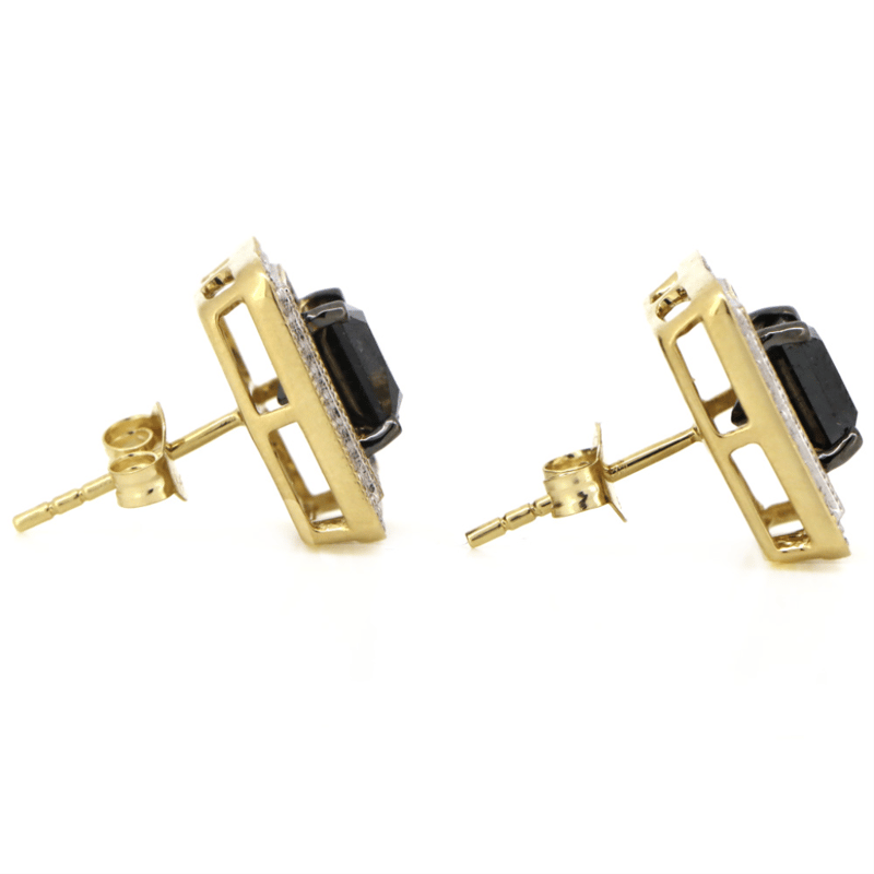 14K YELLOW GOLD, BLACK DIAMOND AND DIAMOND, HALO STUD EARRINGS.
