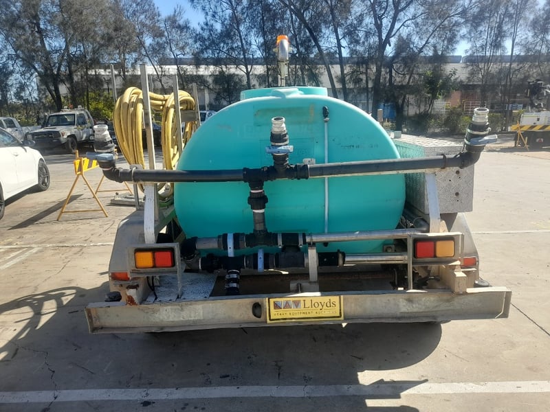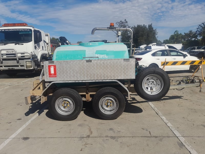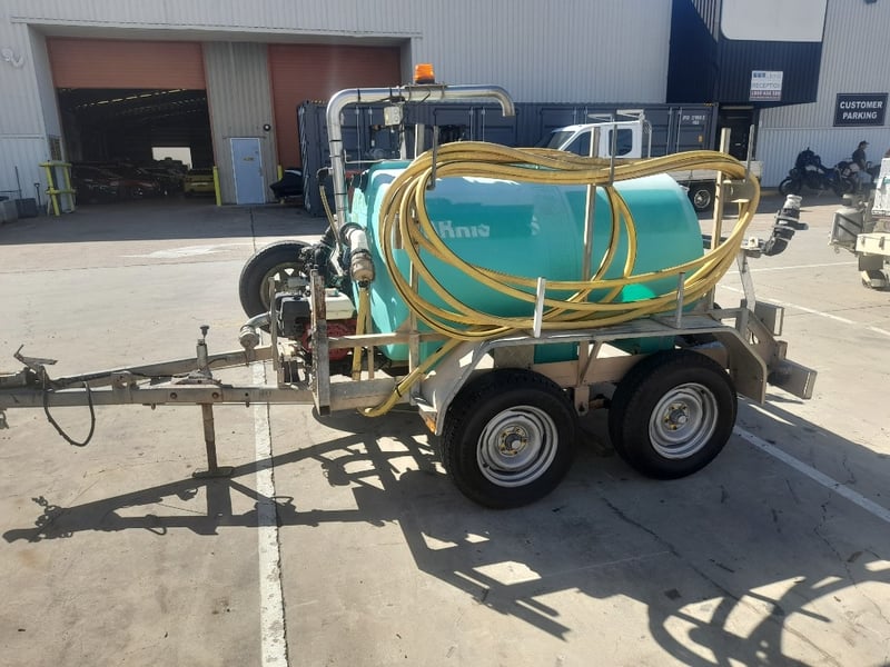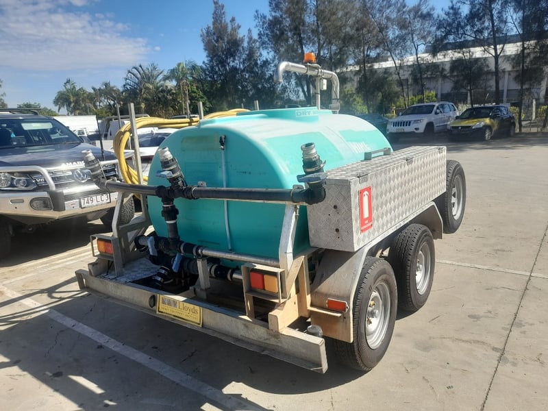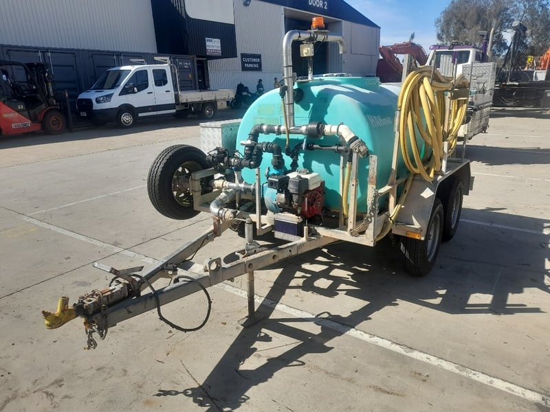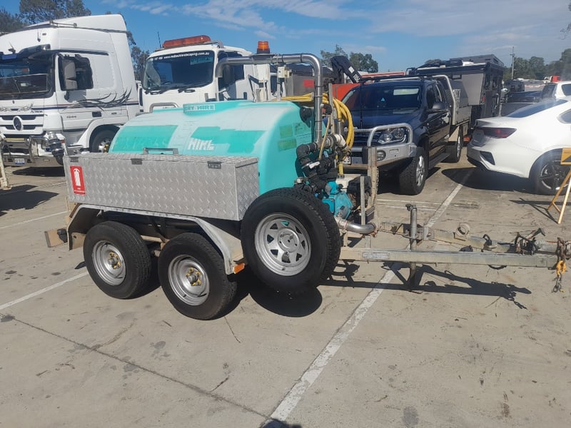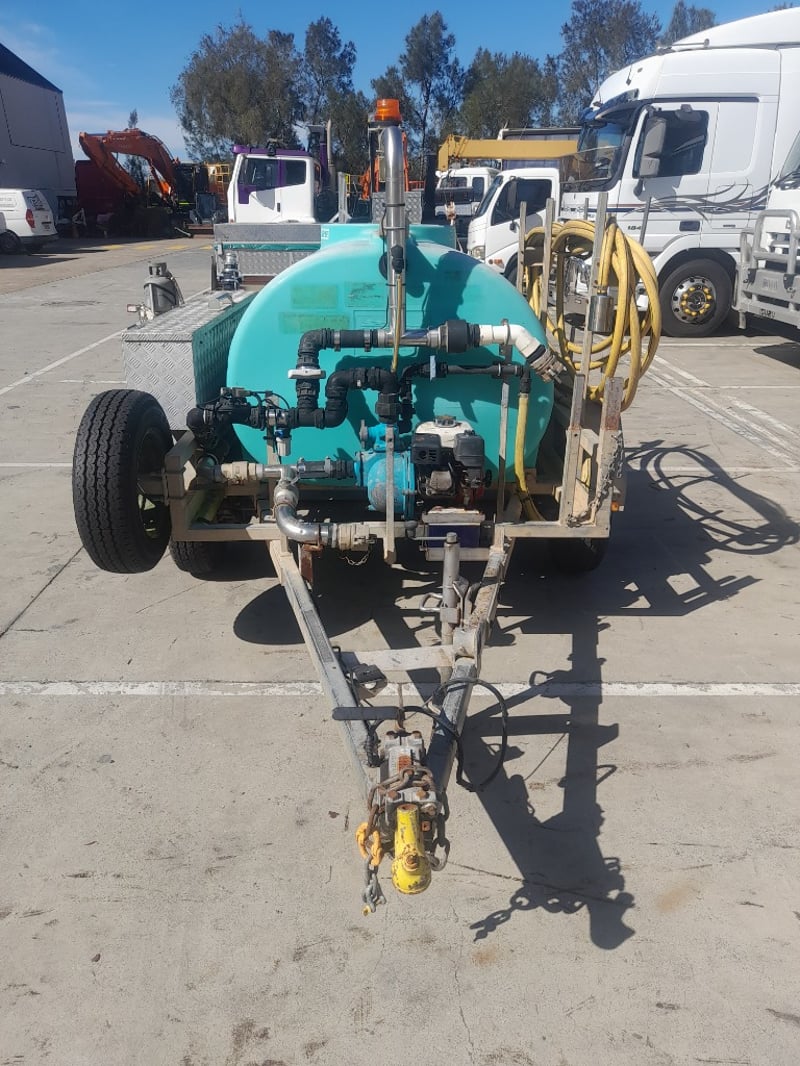 Description: Water carting trailer in working condition, 1500 litre water tank, Honda GX 200 petrol engine attached to water pump, tool box down one side of trailer hose storage on other side, spare tyre, Jockey wheel, 7 pin small round lead