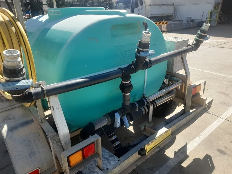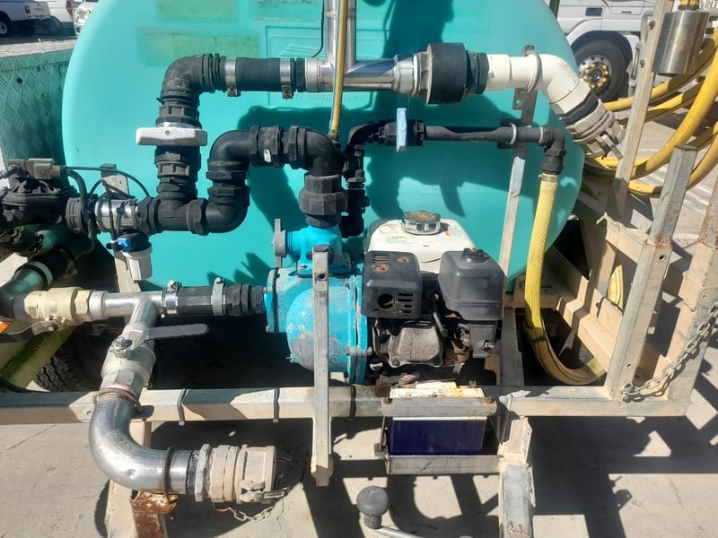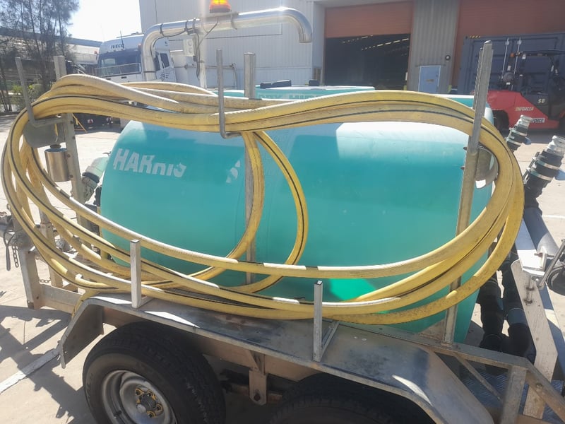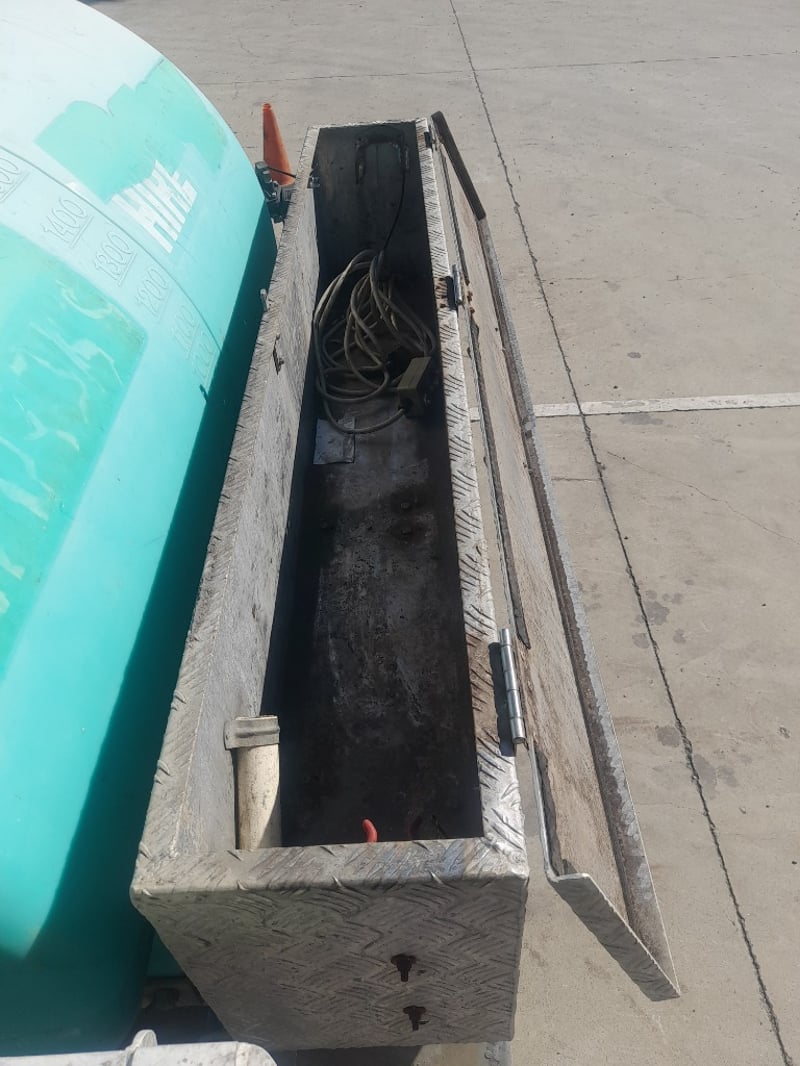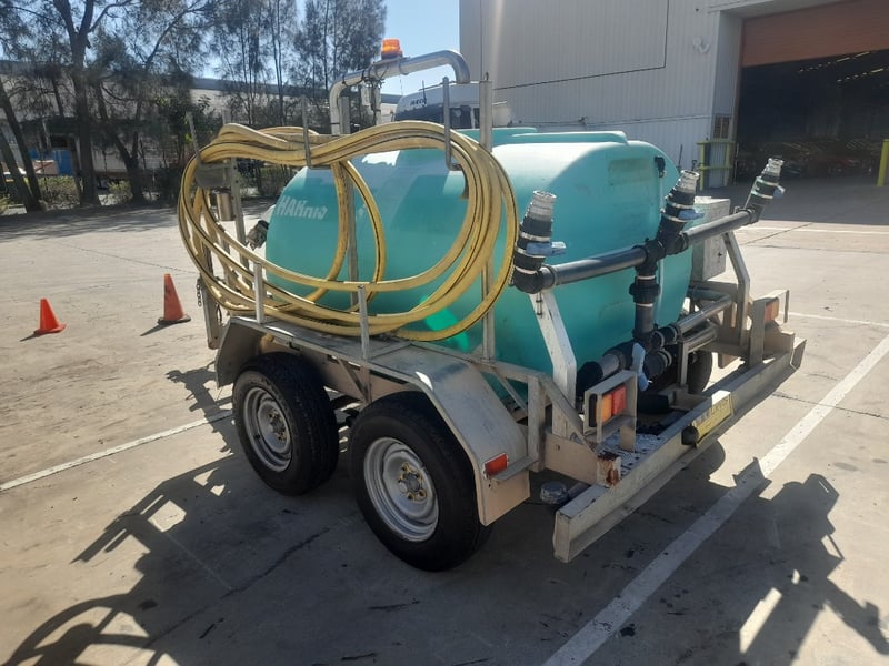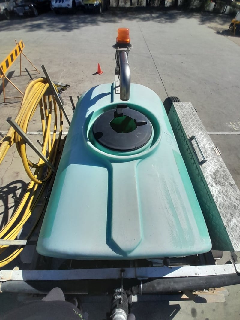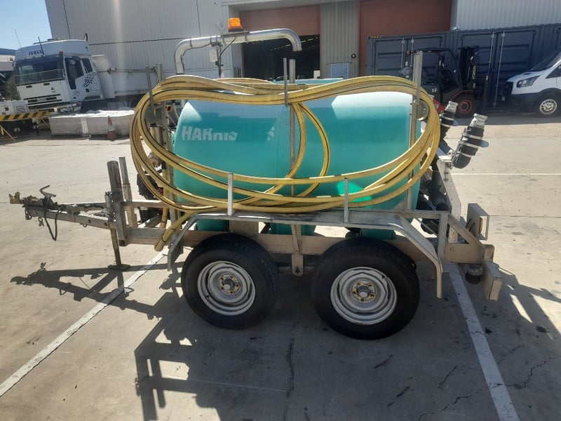Description: Water carting trailer in working condition, 1500 litre water tank, Honda GX 200 petrol engine attached to water pump, tool box down one side of trailer hose storage on other side, spare tyre, Jockey wheel, 7 pin small round lead