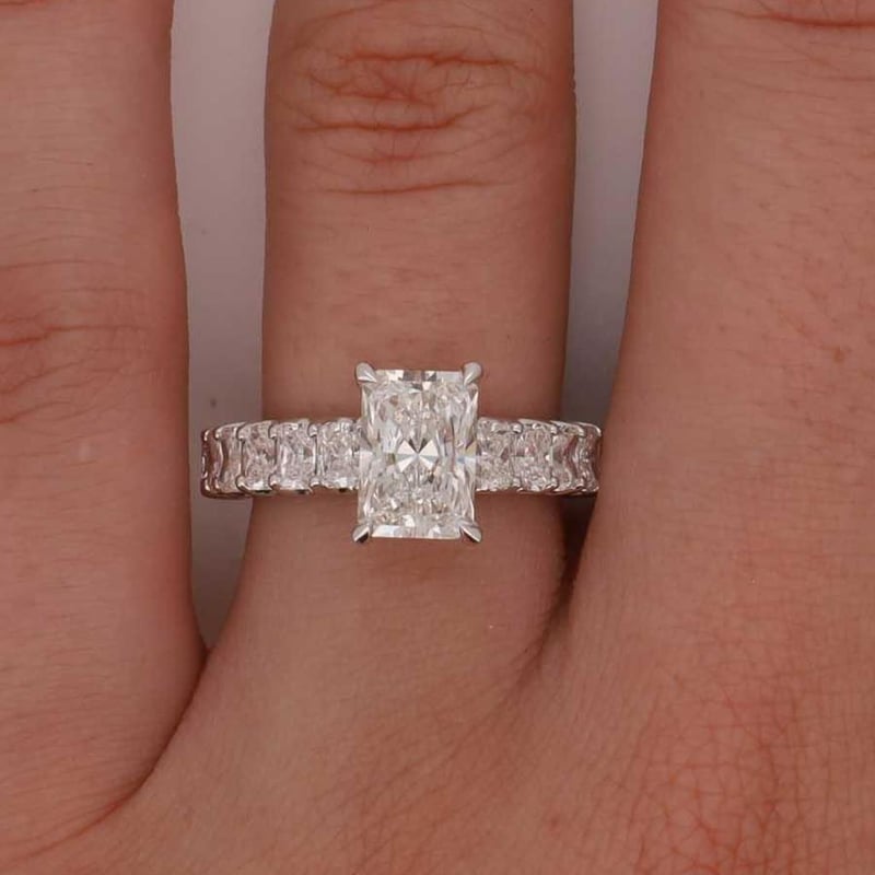 3.38 Carats Diamond Engagement Ring Igi Certified Made In 14K White Gold Centre Diamond = 2.08 Carat Radiant Cut Diamond F/Vs1 Igi Certificate # Lg 671446775 Laser Inscribed : Labgrown Igi Lg 671446775 Cut : Excellent Polish : Excellent Symmetry : Excellent Flourescence : Non Type : Cvd Shoulder Diamonds 12 Diamonds = 1.30 Carats Ring Finger Size M.25 Ring Weight 4.70 Grams