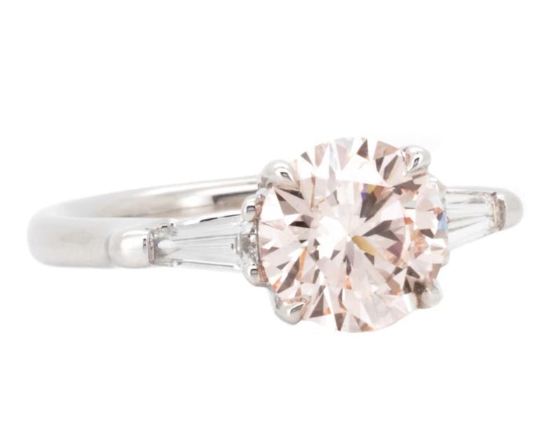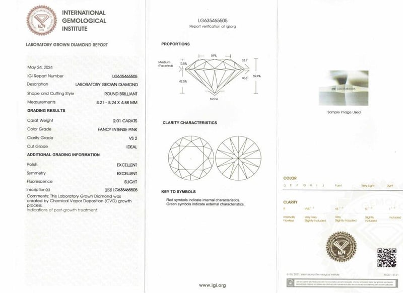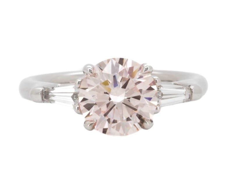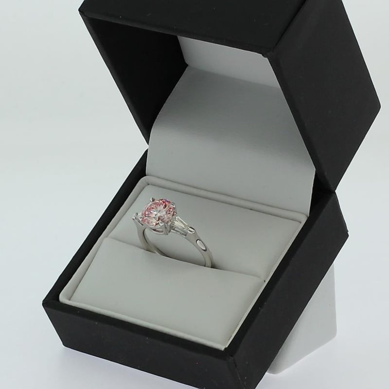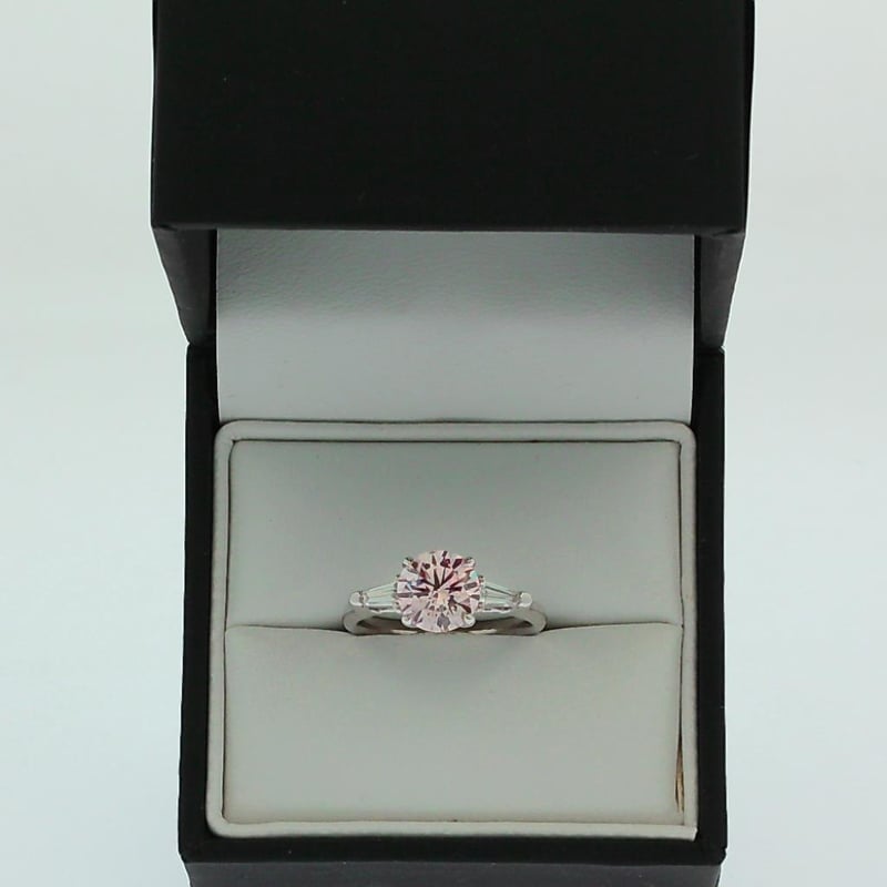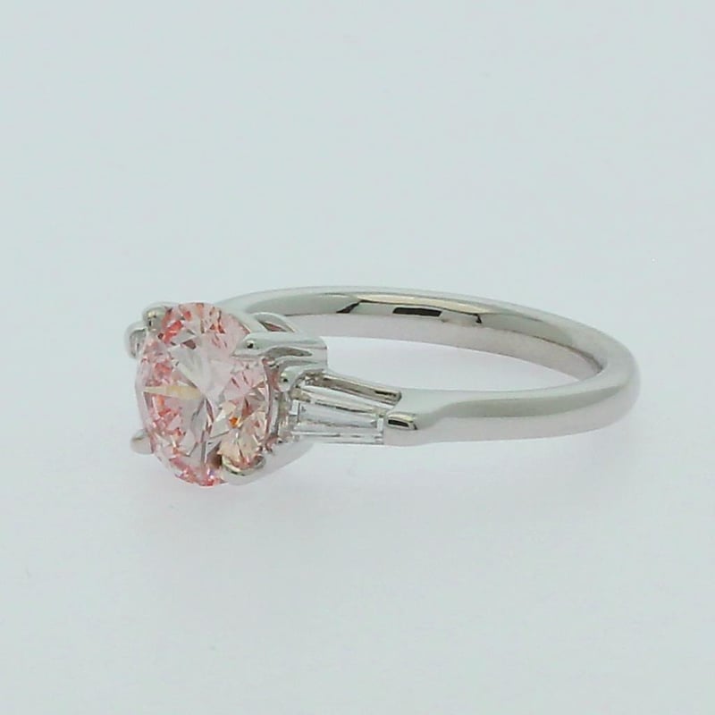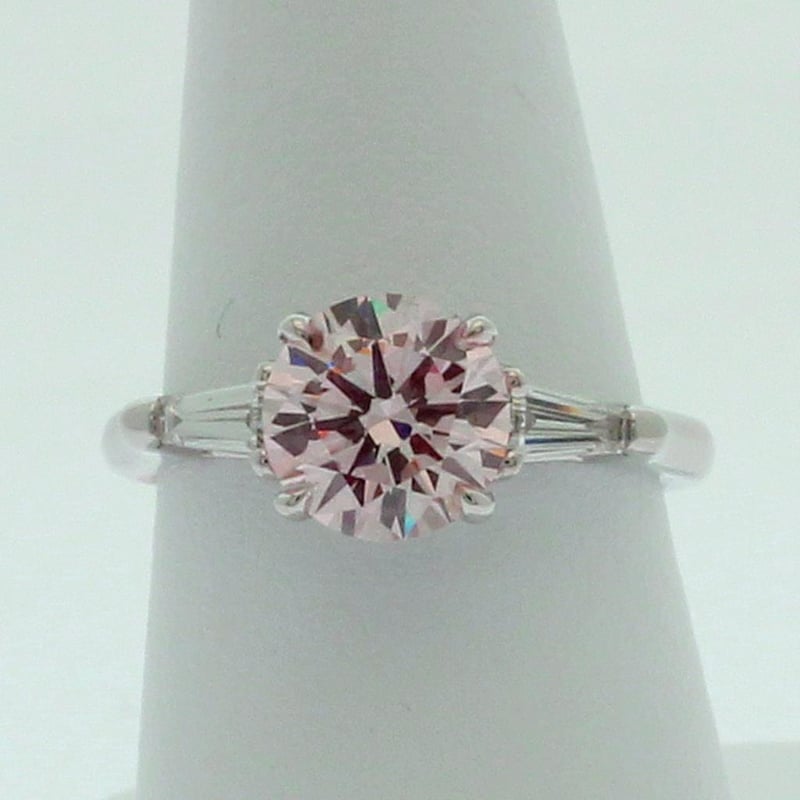 2.40 Carats Diamond Ring Igi Certified Made In 18K White Gold Centre Diamond = 2.01 Carat Round Cut Fancy Intense Pink Vs2 Igi Certificate # Lg 635465505 Laser Inscribed : Labgrown Igi Lg 635465505 Cut : Ideal Polish : Excellent Symmetry : Excellent Flourescence : Slight Type : Cvd Shoulder Diamonds 2 Taper Baguette Diamonds = 0.56 Carats Ring Finger Size M.25 Ring Weight 4.70 Grams