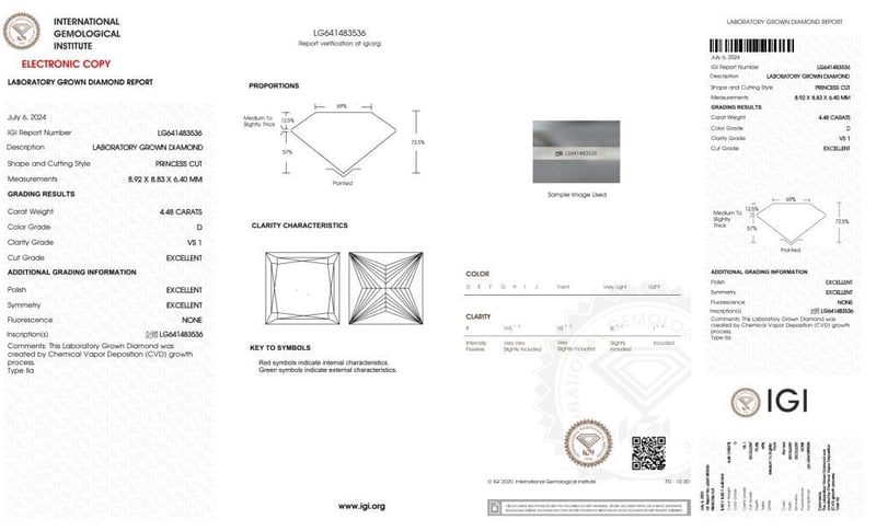 4.48 Carat Princess Cut Diamond D/Vs1 Igi Certificate # Lg 641483536 Laser Inscribed : Labgrown Igi Lg 641483536 Cut : Excellent Polish : Excellent Symmetry : Excellent Flourescence : None Type : Cvd