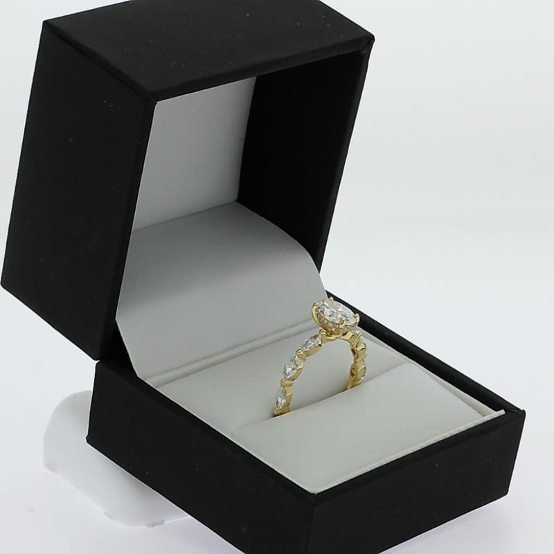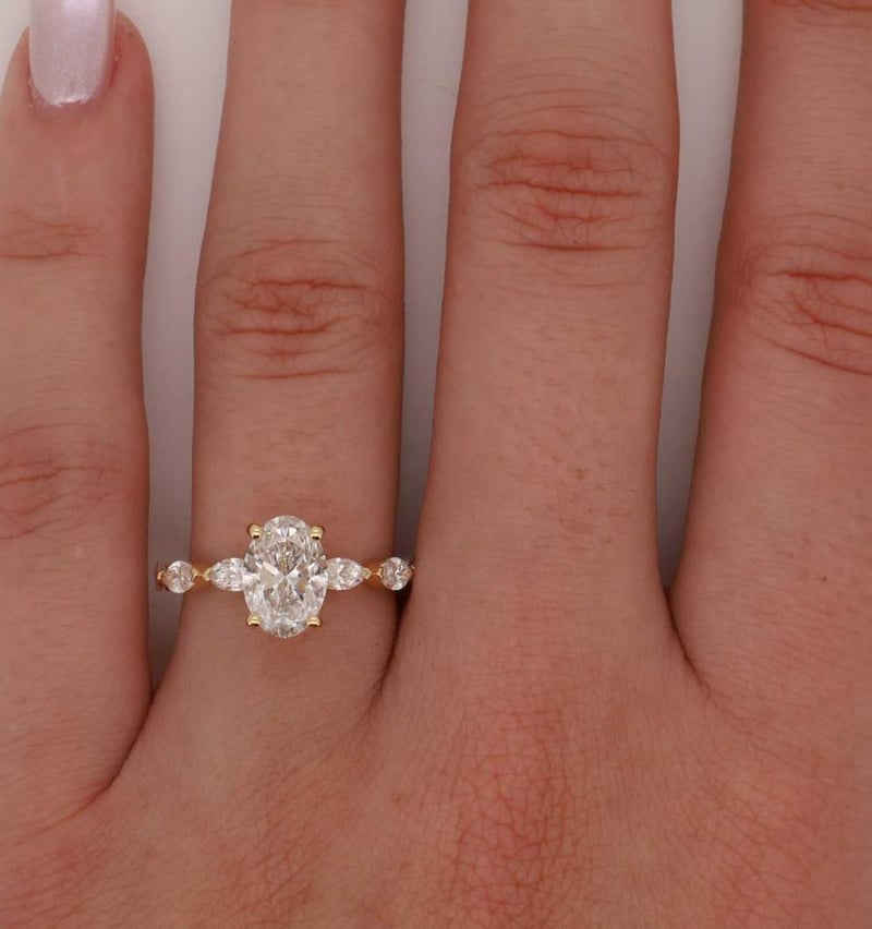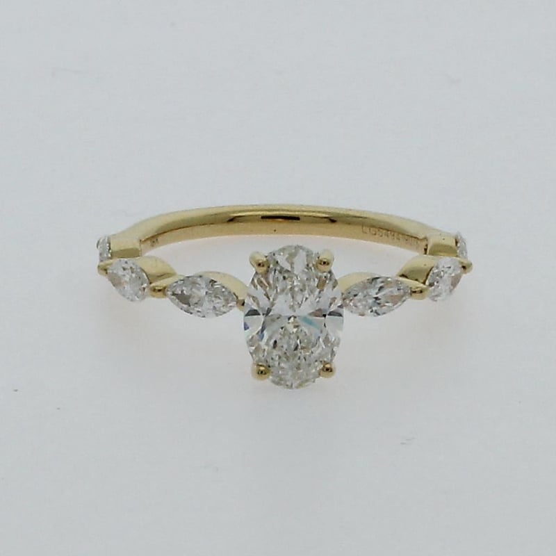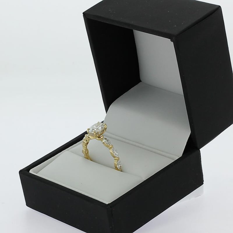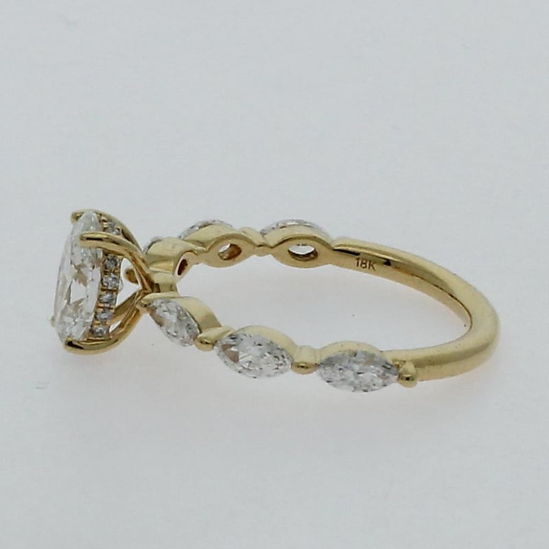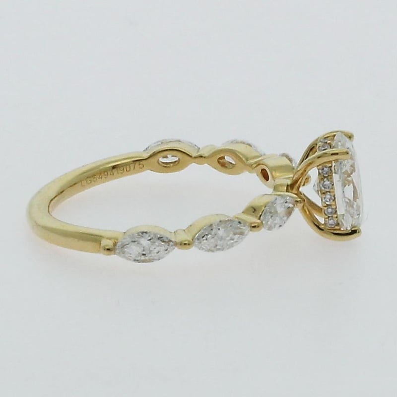 2.33 Carats Diamond Engagement Ring Igi Certified Made In 18K Yellow Gold Centre Diamond = 1.57 Carat Oval Cut Diamond G/Vs1 Igi Certificate # Lg 621408486 Laser Inscribed : Labgrown Igi Lg 621408486 Cut : Excellent Polish : Excellent Symmetry : Excellent Flourescence : Non Type : Cvd 22 Marquise And Round Shoulder Diamonds = 0.76 Carats Ring Finger Size M.25 Ring Weight 3.30 Grams