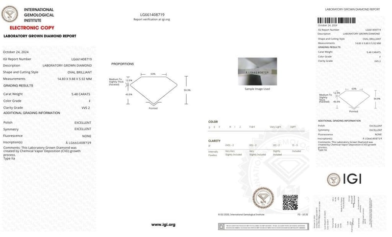 5.48 OVAL SHAPED DIAMOND F/VVS2 5.48 Oval Shaped Diamond F/Vvs2 Igi Certificate # Lg 661408719 Laser Inscribed : Labgrown Igi Lg 661408719 Polish : Excellent Symmetry : Excellent Flourescence : None Type : Cvd Condition: Good - Refer Images 0488974+5