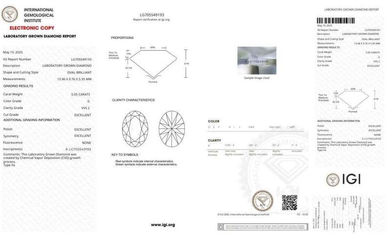 5.05 Oval Shaped Diamond G/Vvs2 Igi Certificate # Lg 705549193 Laser Inscribed : Labgrown Igi Lg 705549193 Cut : Excellent Polish : Excellent Symmetry : Excellent Flourescence : None Type : Cvd