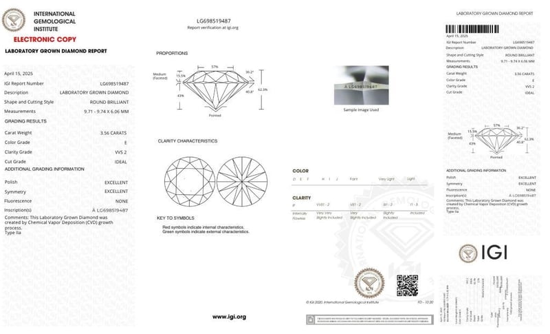 3.56 Carat Round Brilliant Diamond E/Vvs2 Igi Certificate # Lg 698519487 Laser Inscribed : Labgrown Igi Lg 698519487 Cut : Idael Polish : Excellent Symmetry : Excellent Flourescence : None Type : Cvd