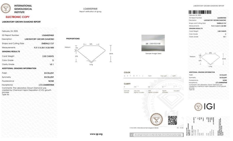 2.50 CARAT EMERALD CUT DIAMOND D/VS 2.50 Carat Emerald Cut Diamond D/Vs1 Igi Certificate # Lg 684509468 Laser Inscribed : Labgrown Igi Lg 684509468 Polish : Excellent Symmetry : Excellent Flourescence : None Type : Cvd Condition: Good - Refer Images 0488974+160