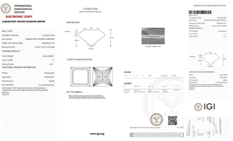 3.50 Carat Princess Cut Diamond F/Vs1 Igi Certificate # Lg 705513256 Laser Inscribed : Labgrown Lg 705513256 Polish : Excellent Symmetry : Excellent Flourescence : None Type : Cvd