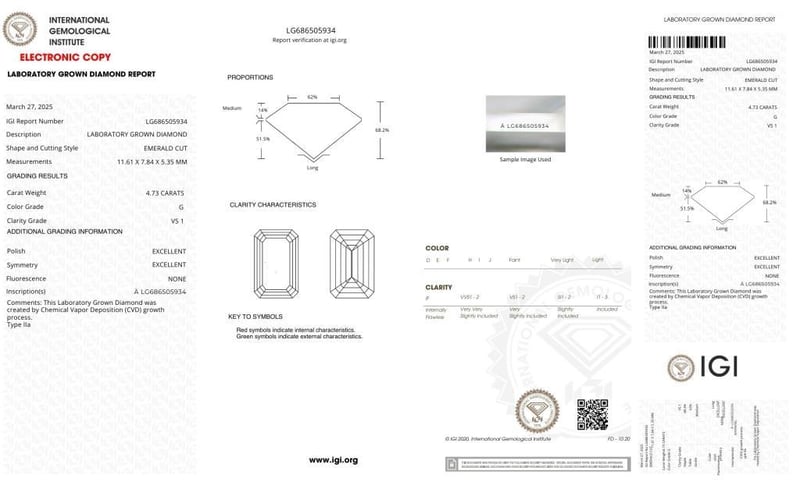 4.73 CARAT EMERALD CUT DIAMOND G/VS 4.73 Carat Emerald Cut Diamond G/Vs1 Igi Certificate # Lg 686505934 Laser Inscribed : Labgrown Igi Lg 686505934 Polish : Excellent Symmetry : Excellent Flourescence : None Type : Cvd Condition: Good - Refer Images 0488974+30