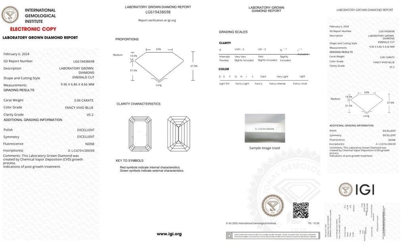 3.06 Carat Emerald Cut Diamond Fancy Vivid Blue /Vs2 Igi Certificate # Lg 619438698 Laser Inscribed : Labgrown Igi Lg 619438698 Polish : Excellent Symmetry : Excellent Flourescence : None Type : Cvd