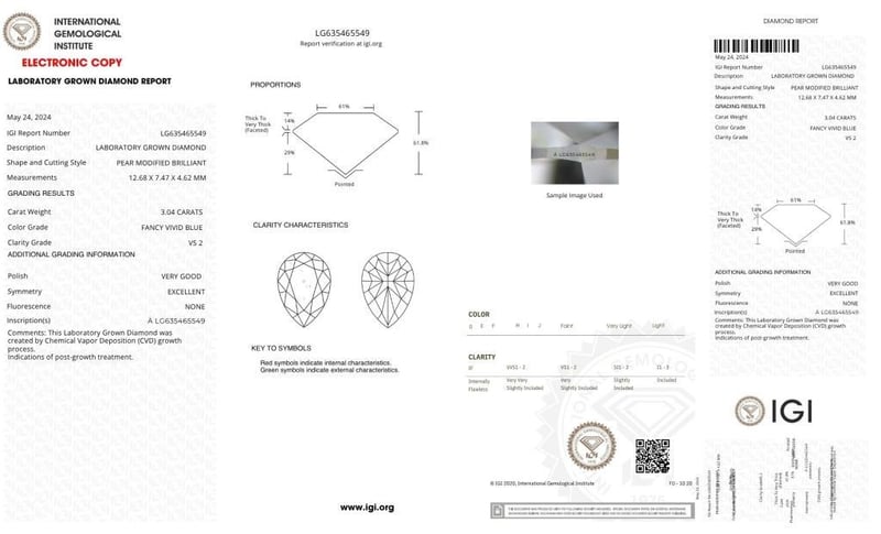3.04 Carat Pear Shape Diamond Fancy Vivid Blue /Vs2 Igi Certificate # Lg 635465549 Laser Inscribed : Labgrown Igi Lg 635465549 Polish : Very Good Symmetry : Excellent Flourescence : None Type : Cvd