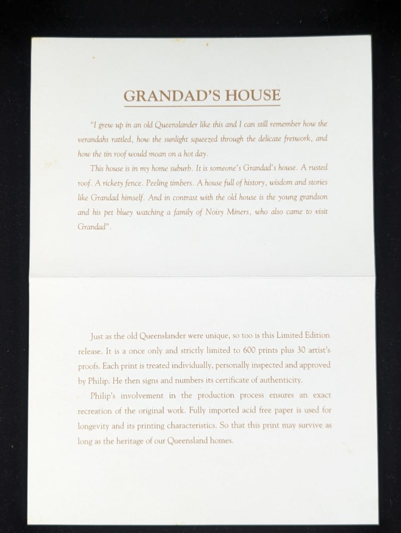 LIMITED EDITION PHILIP FARLEY SIGNED ''GRANDAD'S HOUSE'' LITHOGRAPH ON PAPEREdition Number: 234/600Image Size: 54Cm X 74CmFrame Size: 90Cm H X 110CmSigned Lower RightIncludes Certificate Of AuthenticityCondition: Good - Refer To Images12B587761+10