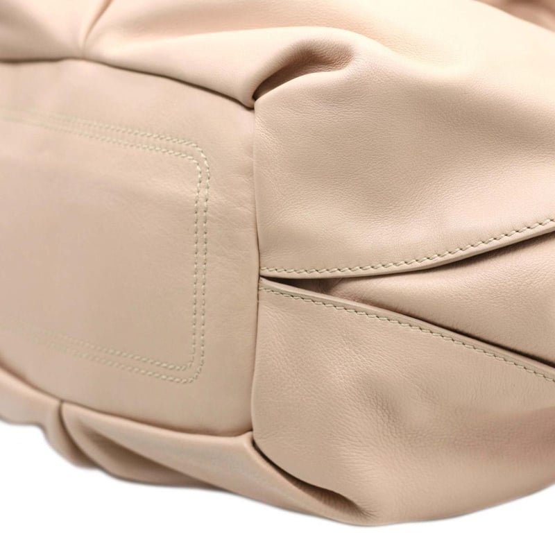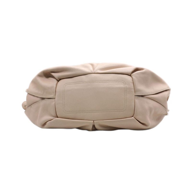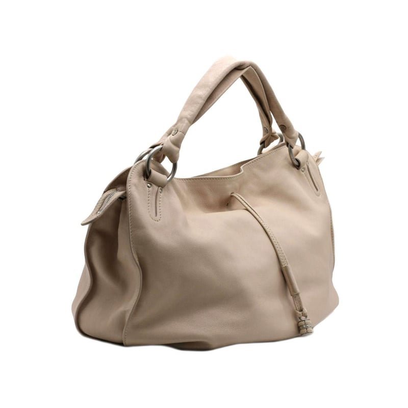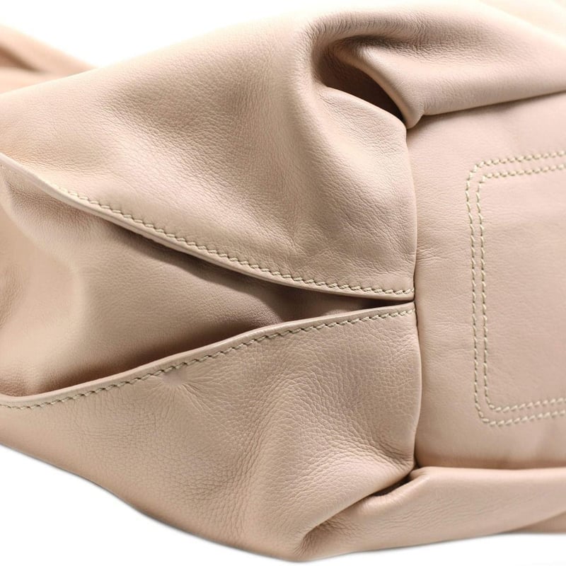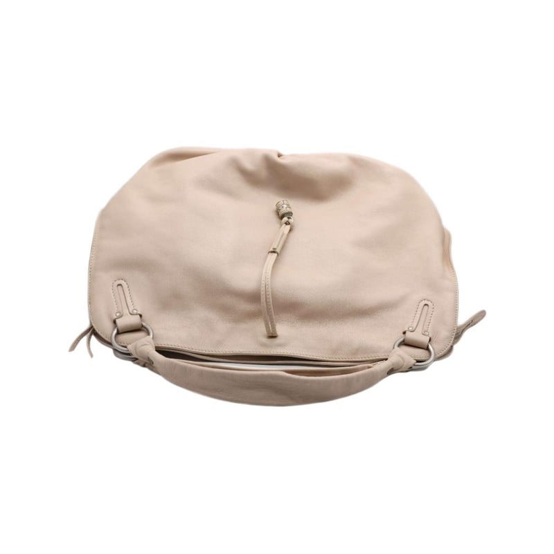 This capacious ‘Bittersweet’ hobo by Celine is crafted from beige leather with silver tone hardware and ringed shoulder straps.