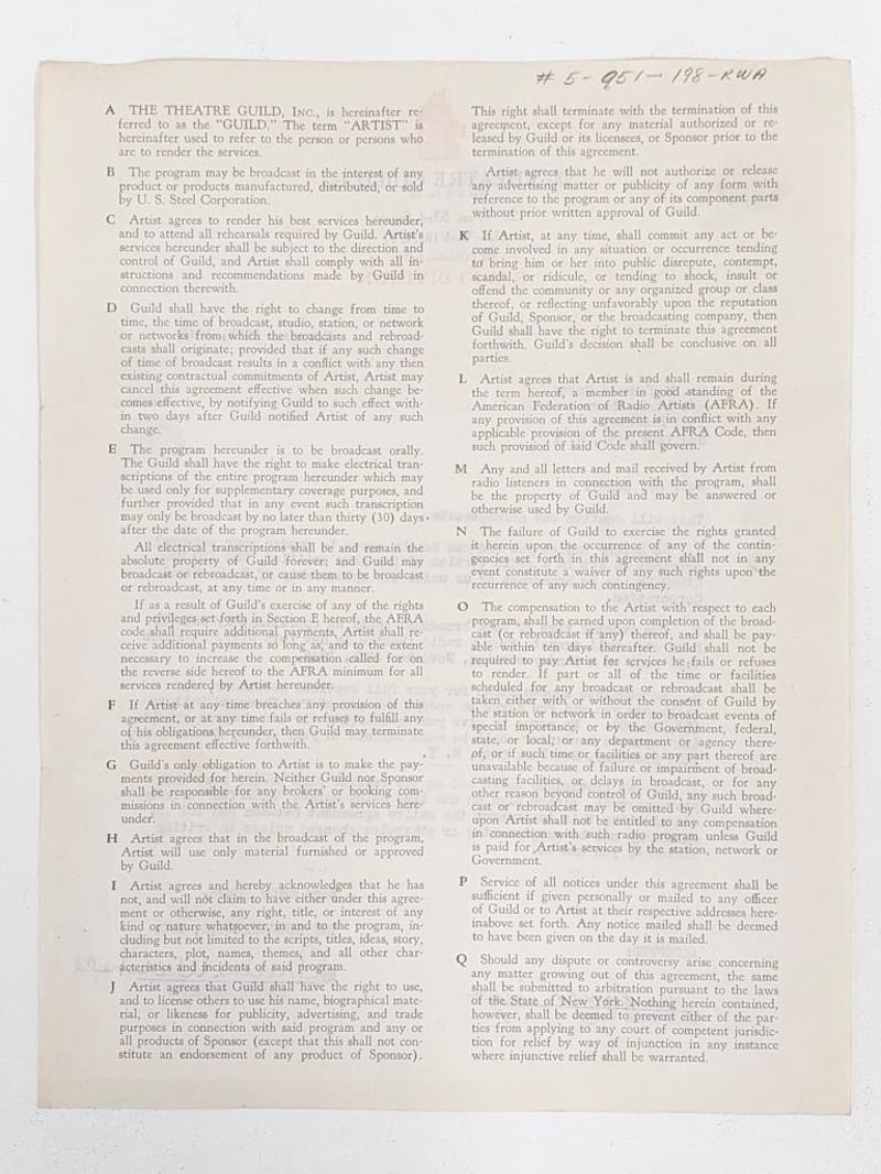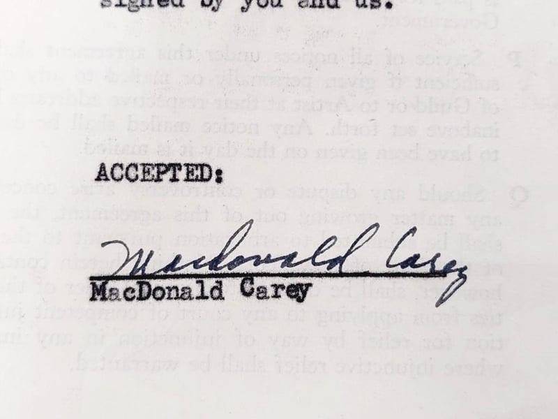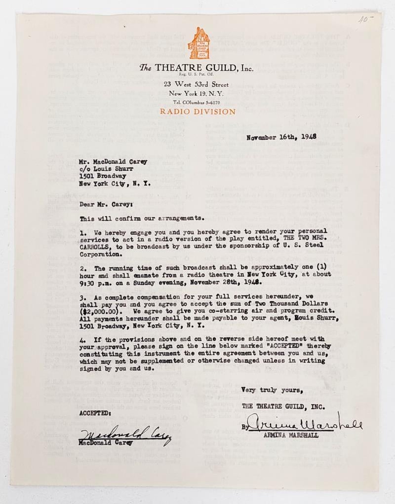 MACDONALD CAREY HANDSIGNED "THE THEATRE GUILD" CONTRACTComes With Certificate Of Authenticity Size: Condition: Excellent - Refer To Images155566+93