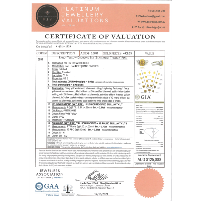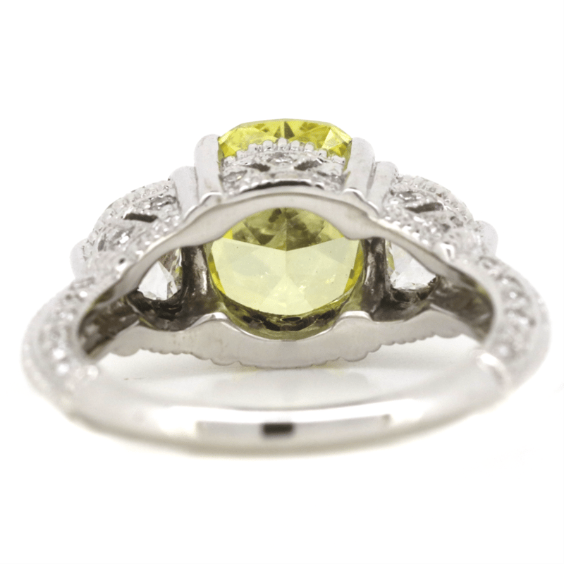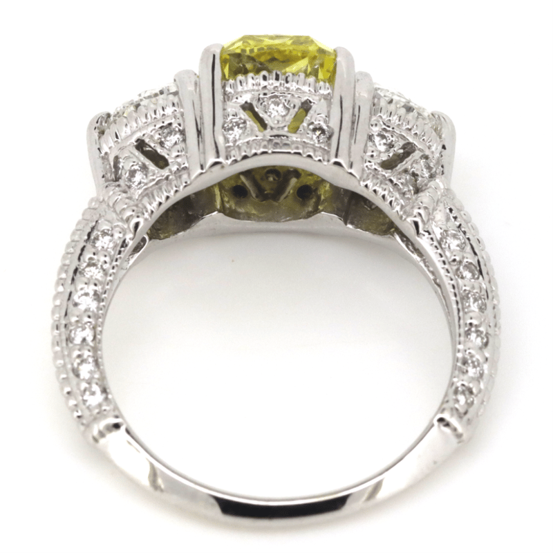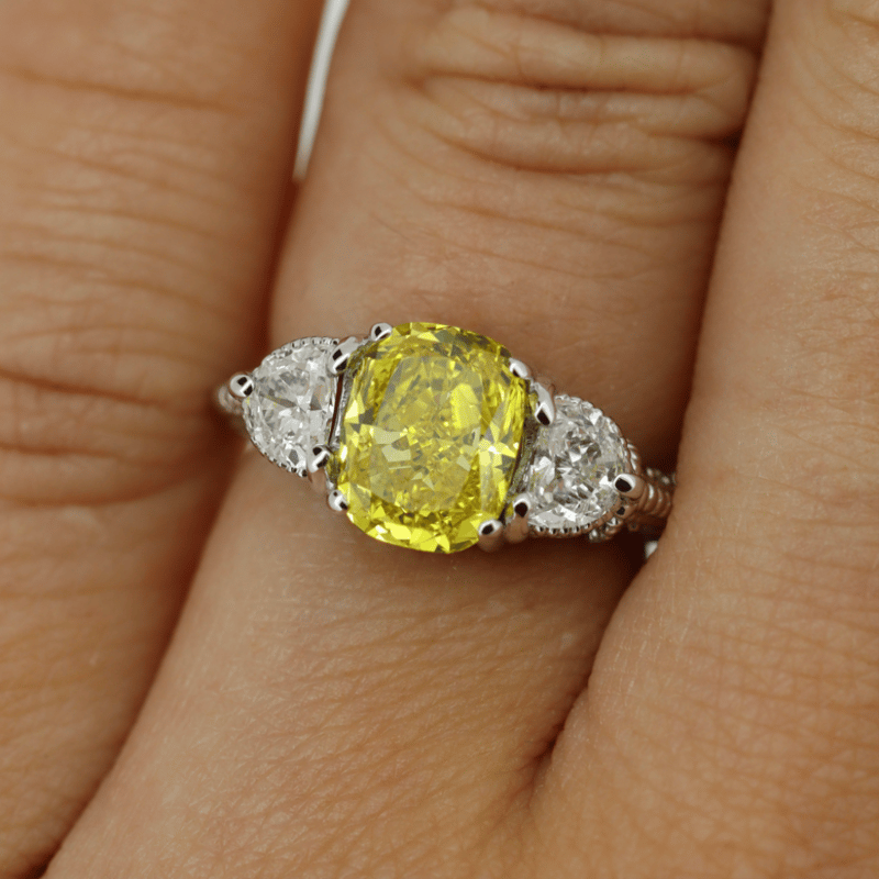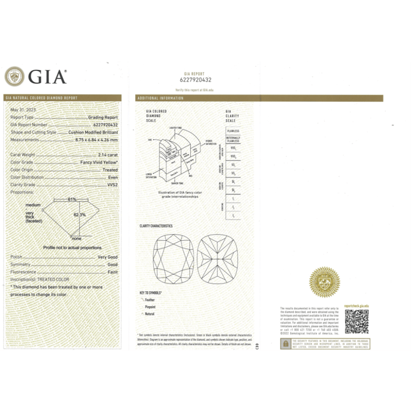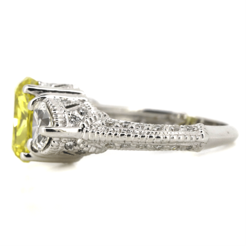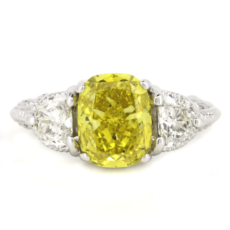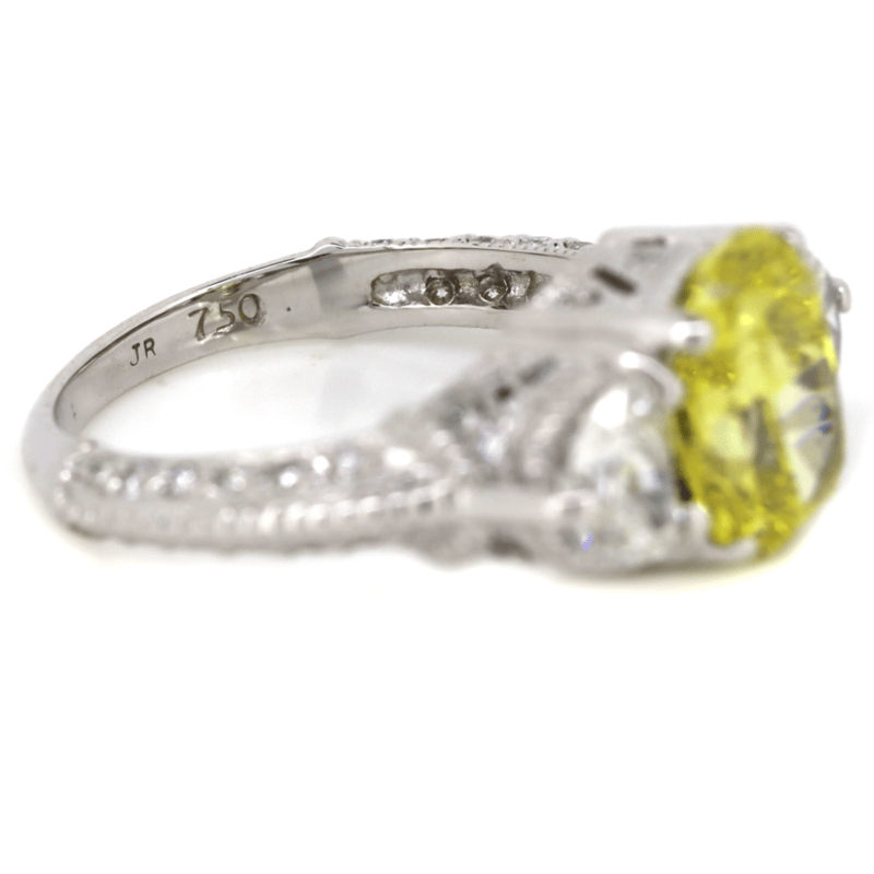 The Centre Features, One Cushion Modified Cut, Fancy Vivid Yellow, Diamond (2.14Ct, Vvs2 Clarity, Enhanced, Gia Report: 6227920432), 4 Claw Set. Decorating The Shoulders Are, 2 Trilliant Cut, And 42 Round Brilliant Cut, Diamonds (0.91Ct Tdw, G-H Colour, Si1-Si2 Clarity), Claw/Micro-Bead Set. Ring Size J.