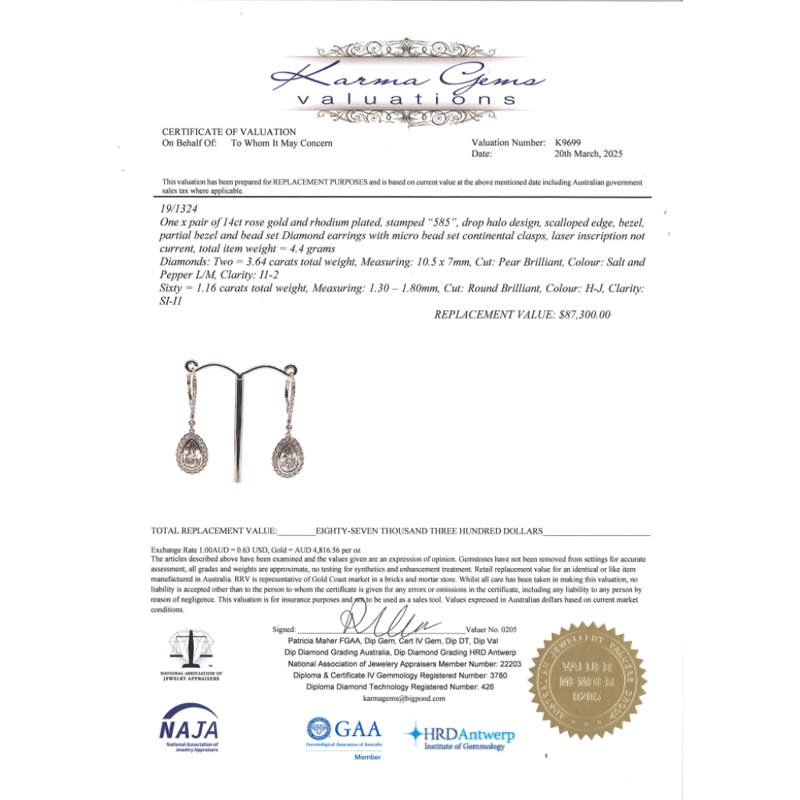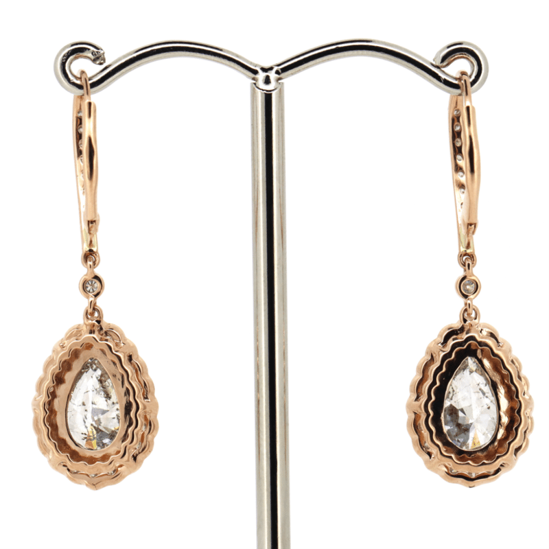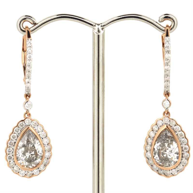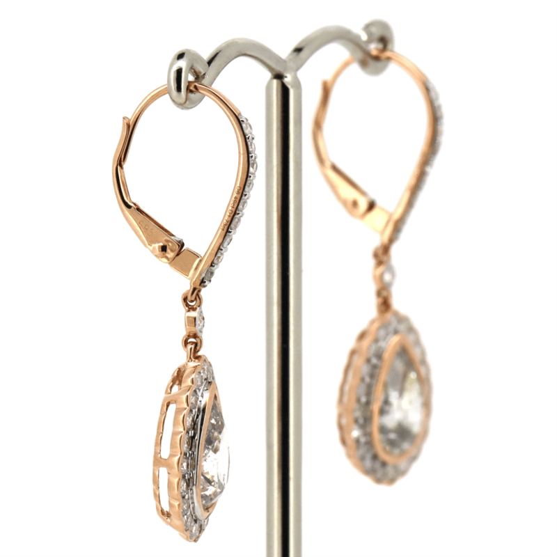 The Central Design Features, 2 Pear Modified Brilliant Cut, Diamonds (3.64Ct Tdw, L-M Colour, P1-P2 Clarity), Bezel Set. Surrounding The Central Design In Halos And Decorating The Hooks Are, 60 Round Brilliant Cut, Diamonds (1.16Ct Tdw, H-J Colour, Si-I1 Clarity), Bead Set. The Earrings Feature Shepherd Hooks With Spring Back Safety Latch.