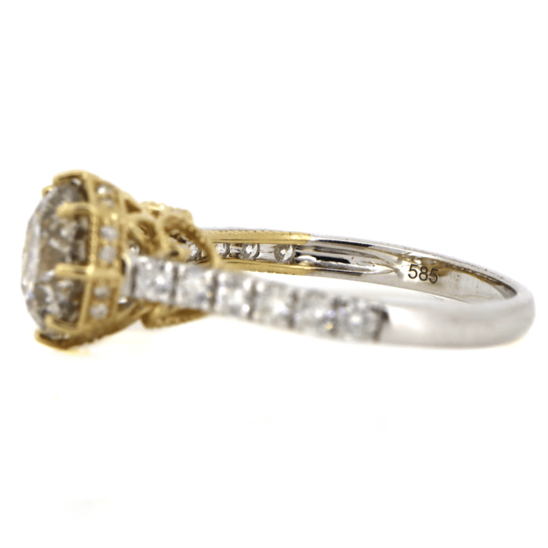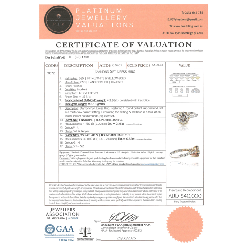 14K WHITE/YELLOW GOLD AND DIAMOND, DRESS RING. The Centre Features, One Round Brilliant Cut, Diamond (2.36Ct Tdw, K-L Colour, Salt & Pepper Clarity), Multi-Claw Set. Decorating The Setting And The Band Are, 30 Round Brilliant Cut, Diamonds (0.52Ct Tdw, G-H Colour, Si1-Si2 Clarity), Pip-Claw Set. Ring Size M 1/2. Valuations Provided by an Independent Third-Party Professional Not Directly Associated With Lloyds Auctions at AUD $$40,000.00This valuation has been conducted by an independent third-party professional. The valuation amount is an assessment by the issuing valuer and does not reflect the auction value of the item. Any inquiries regarding the valuation should be directed to the issuing valuer (refer to contact details on the certificate), as Lloyds Auctions has no affiliation or influence over the valuation, the valuer, or the stated amount. Condition: Good - Refer Images 0+5319