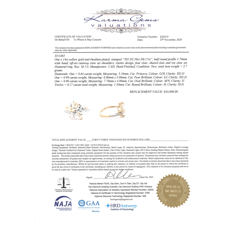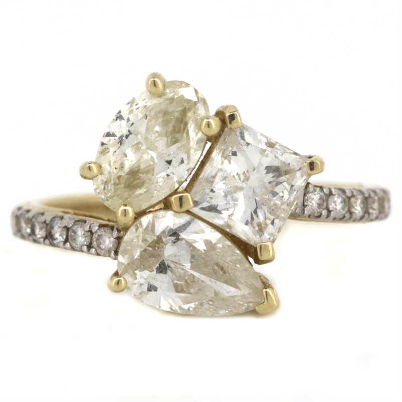 The Ring Features, One Princess Cut, Diamond (0.64Ct, G-H Colour, Si2-I1 Clarity), 4 Claw Set. Decorating The Peice Are, One Pear Brilliant Cut, Diamond (0.99Ct, I-J Colour, Si2-I1 Clarity), Claw Set And One Oval Brilliant Cut, Diamond (0.96Ct, M-N Colour, I1 Clarity), Claw Set. Decorating The Band Are, 12 Round Brilliant Cut, Diamonds (0.17Ct Tdw, H Colour, Si-I1 Clarity), Claw Set. Ring Size M 1/2.