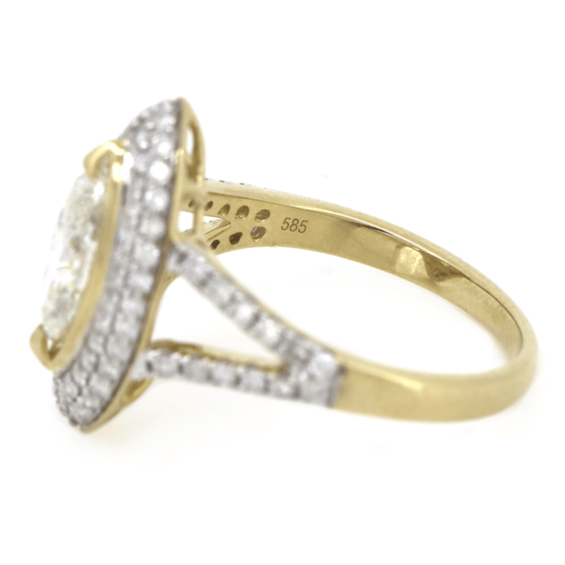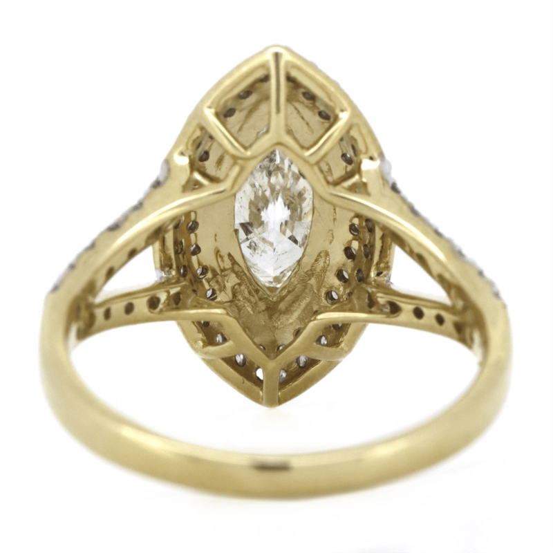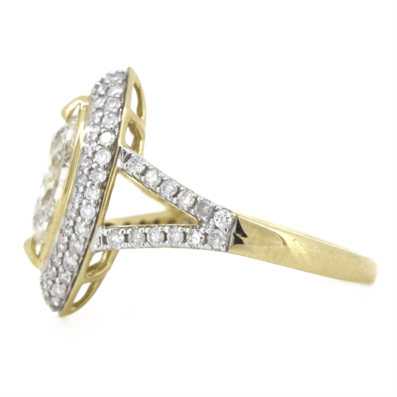 The Centre Features, One Marquise Brilliant Cut, Diamond (1.01Ct, L-M Colour, P1-P2 Clarity), 2 Claw Set. Surrounding The Centre In A Halo And Decorating The Split Band Are, 82 Round Brilliant Cut, Diamonds (0.52Ct Tdw, G-H Colour, Si1-Si2 Clarity), Micro-Bead/Pip-Claw Set. Ring Size P.