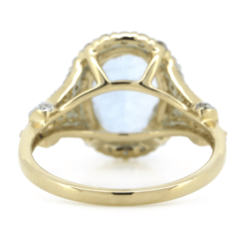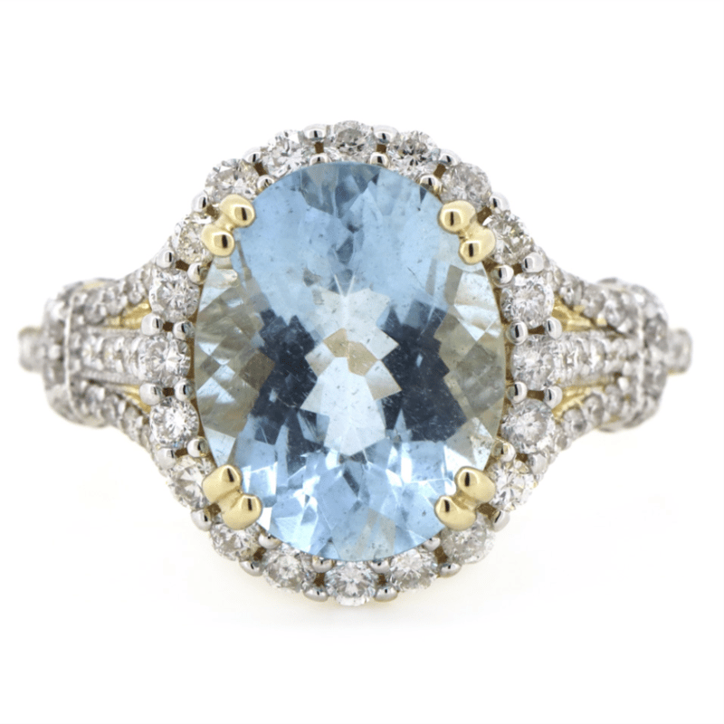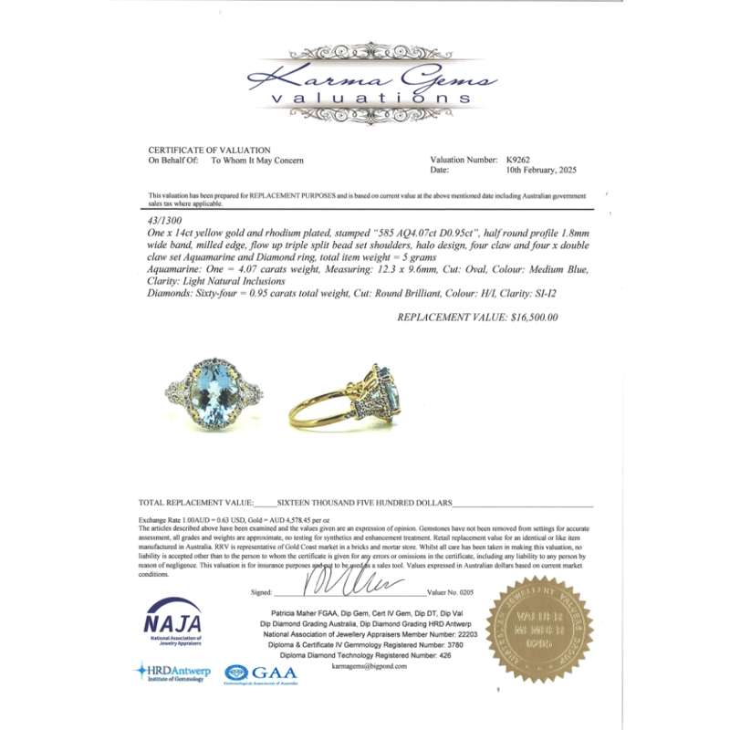 14K YELLOW GOLD, AQUAMARINE AND DIAMOND RING. The Centre Features, One Oval Cut, Medium Blue, Aquamarine (4.07Ct, Light Natural Inclusions), Double 4 Claw Set. Surrounding The Centre And Decorating The Band Are, 64 Round Brilliant Cut, Diamonds (0.95Ct Tdw, H-I Colour, Si-I2 Clarity), Bead Set In White Gold. Ring Size O. Valuations Provided by an Independent Third-Party Professional Not Directly Associated With Lloyds Auctions at AUD $$16,500.00This valuation has been conducted by an independent third-party professional. The valuation amount is an assessment by the issuing valuer and does not reflect the auction value of the item. Any inquiries regarding the valuation should be directed to the issuing valuer (refer to contact details on the certificate), as Lloyds Auctions has no affiliation or influence over the valuation, the valuer, or the stated amount. Condition: Good - Refer Images 0+5328