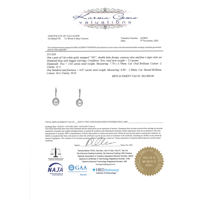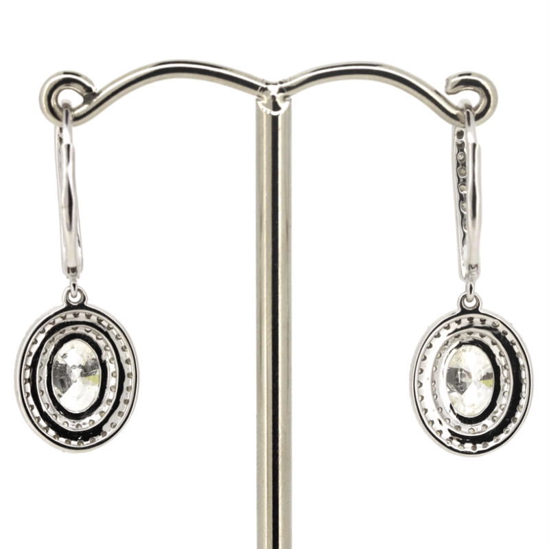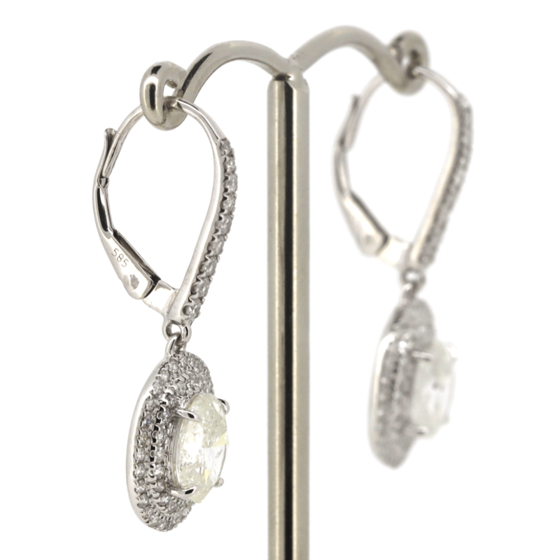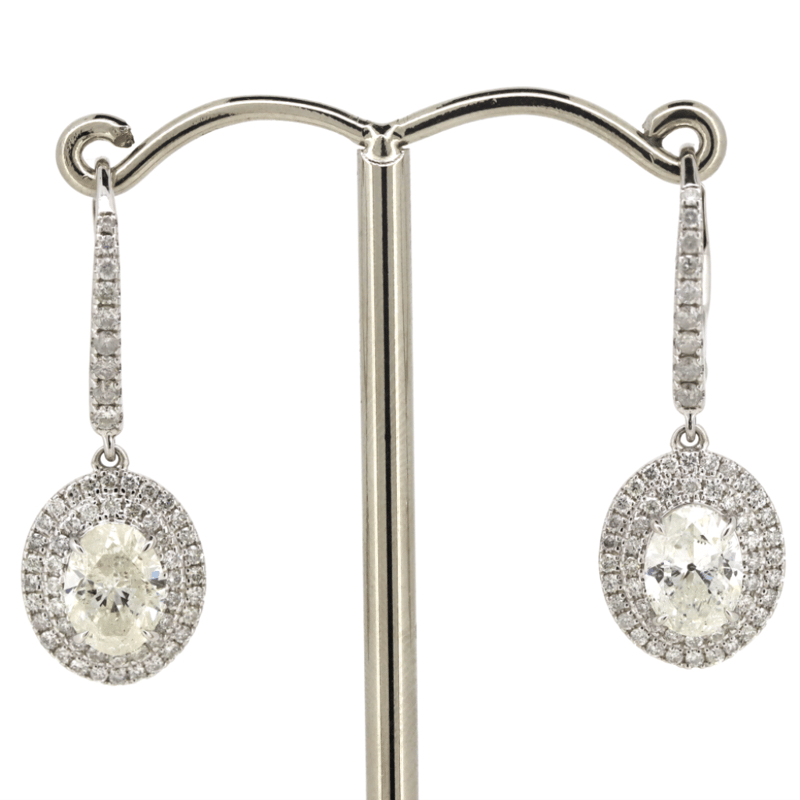 The Centres Feature, 2 Oval Brilliant Cut, Diamonds (2.02Ct Tdw, J Colour, I1-2 Clarity), Claw Set. Decorating The Centre In A Double Halo Are, 114 Round Brilliant Cut, Diamonds (0.67Ct Tdw, H-J Colour, Si-I2 Clarity), Claw Set. The Earrings Feature A Huggie Style Hooks.