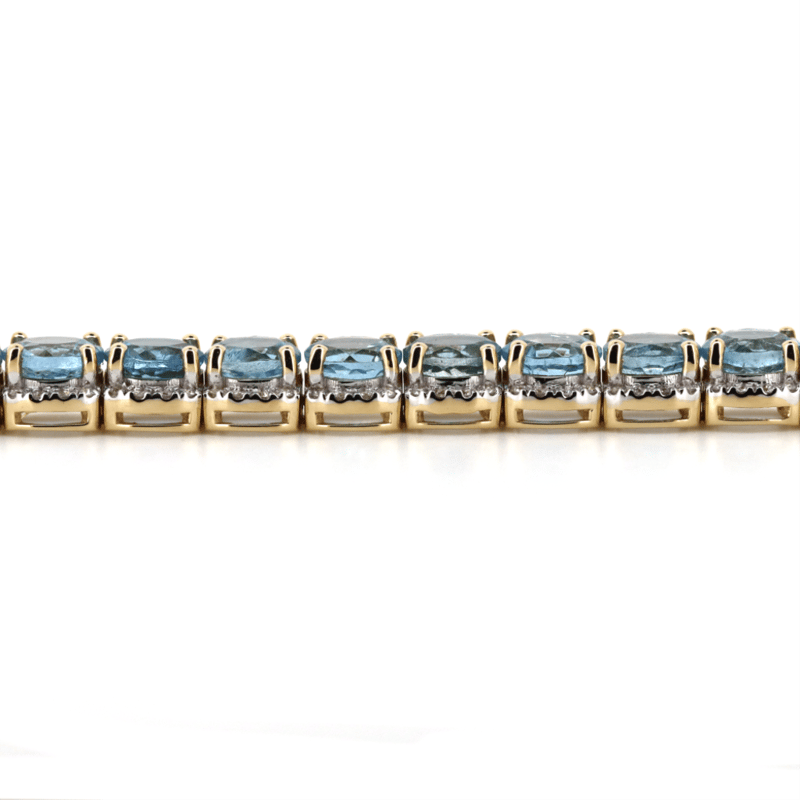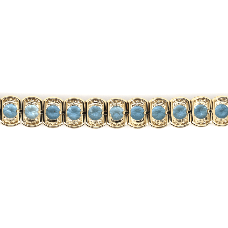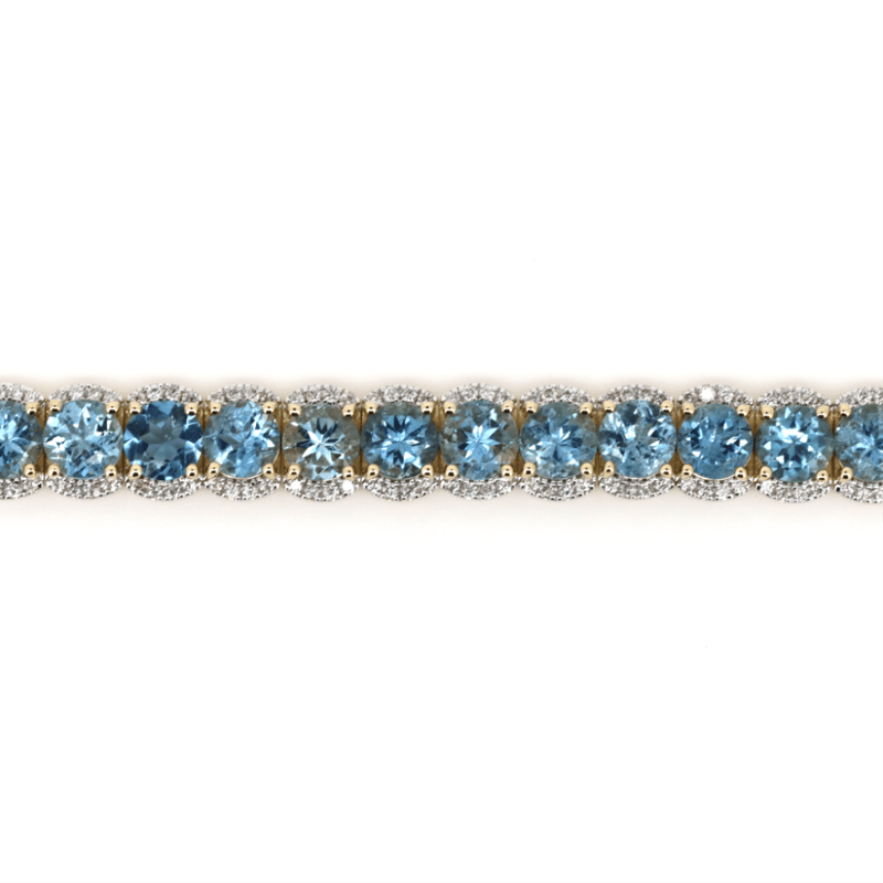 14K YELLOW GOLD, AQUAMARINE AND DIAMOND, LINE HALO BRACELET.