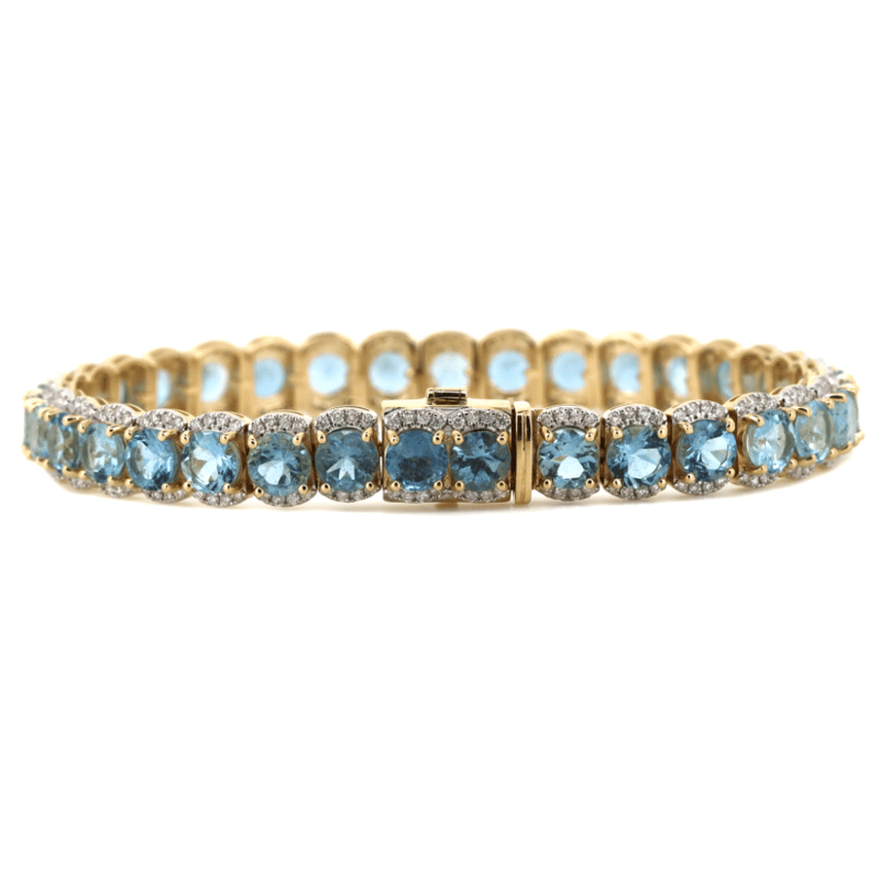The Bracelet Features, 34 Round Cut, Aquamarines (16.12Ct Tsw, Light-Moderate Inclusions), Claw Set. Encompassing The Centre In A Halo Are, 272 Round Brilliant Cut, Diamonds (1.37Ct Tdw, G-K Colour, Si-I2 Clarity), Bead Set. The Bracelet Features A, Spring Tongue Box Clasp With Safety Bar Clip Attached. 18Cm Long.