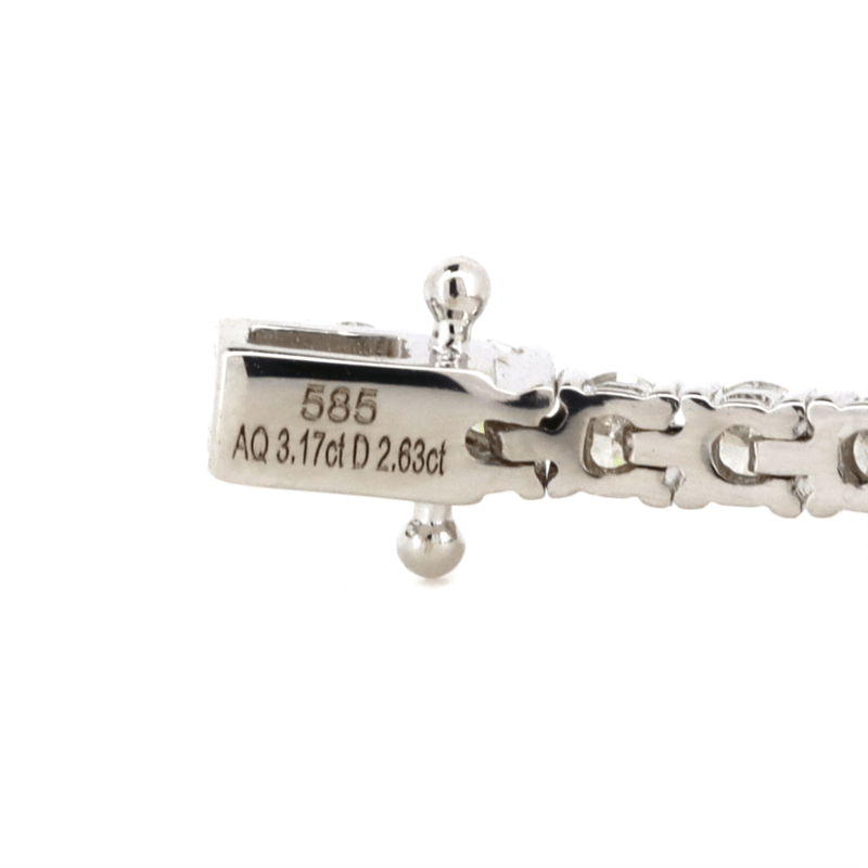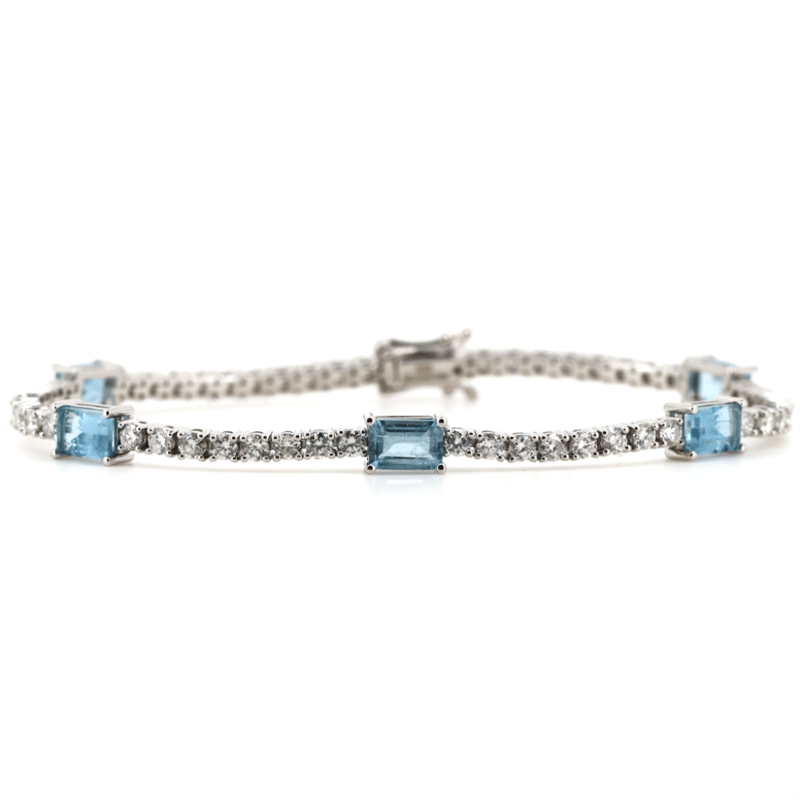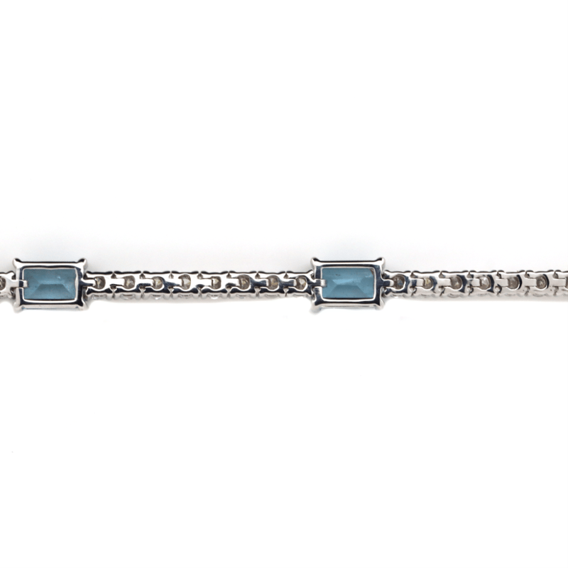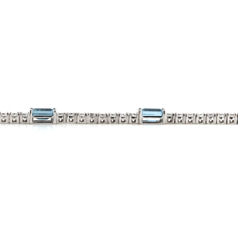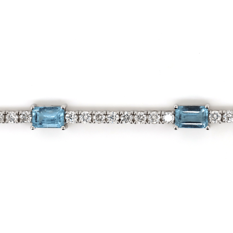 14K WHITE GOLD, AQUAMARINE AND DIAMOND, LINE BRACELET. The Design Features, 5 Emerald Cut, Aquamarines (3.17Ct Tsw, Light Moderate Inclusions), 4 Claw Set At Intervals. Embellishing The Bracelet Are, 52 Round Brilliant Cut, Diamonds (2.63Ct Tdw, H-K Colour, Si-I2 Clarity), Claw Set In A Single Row. The Bracelet Has A Box Clasp With 2 Figure Eight Safety Clips. Bracelet Length Is 17.5Cm. Valuations Provided by an Independent Third-Party Professional Not Directly Associated With Lloyds Auctions at AUD $$43,600.00This valuation has been conducted by an independent third-party professional. The valuation amount is an assessment by the issuing valuer and does not reflect the auction value of the item. Any inquiries regarding the valuation should be directed to the issuing valuer (refer to contact details on the certificate), as Lloyds Auctions has no affiliation or influence over the valuation, the valuer, or the stated amount. Condition: Good - Refer Images 0+5315