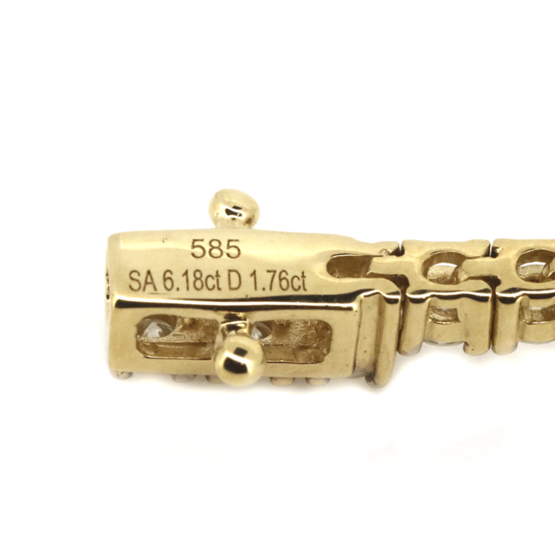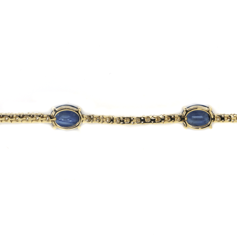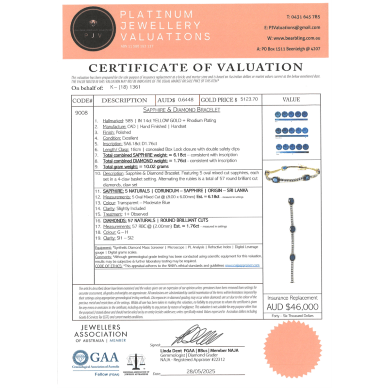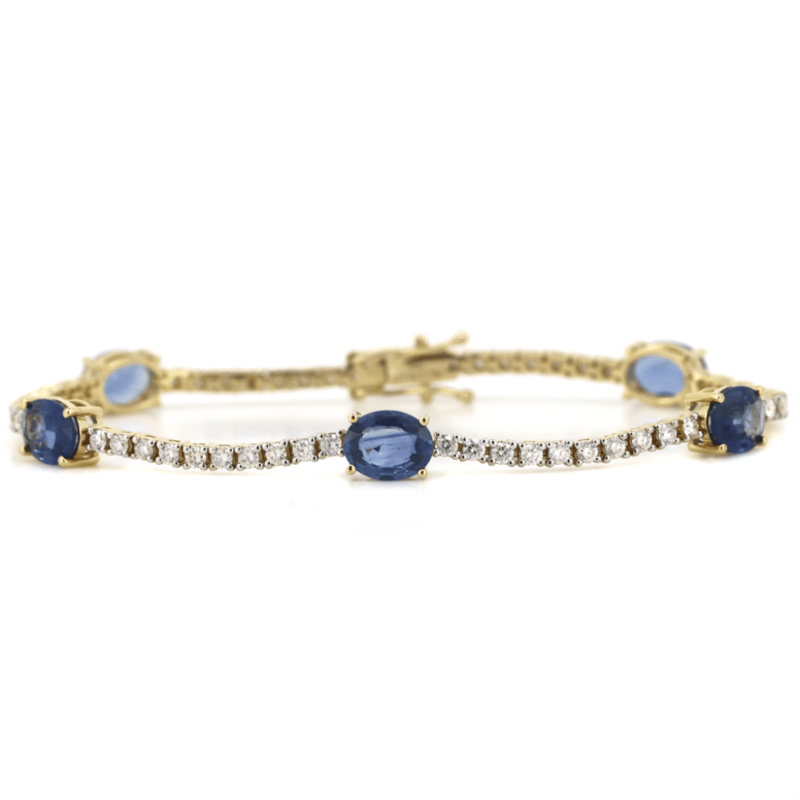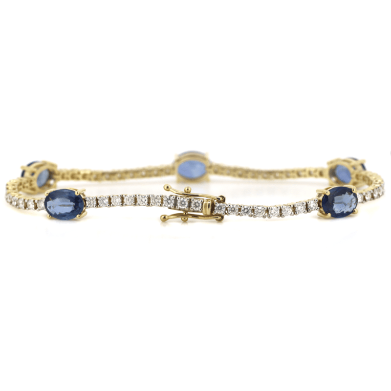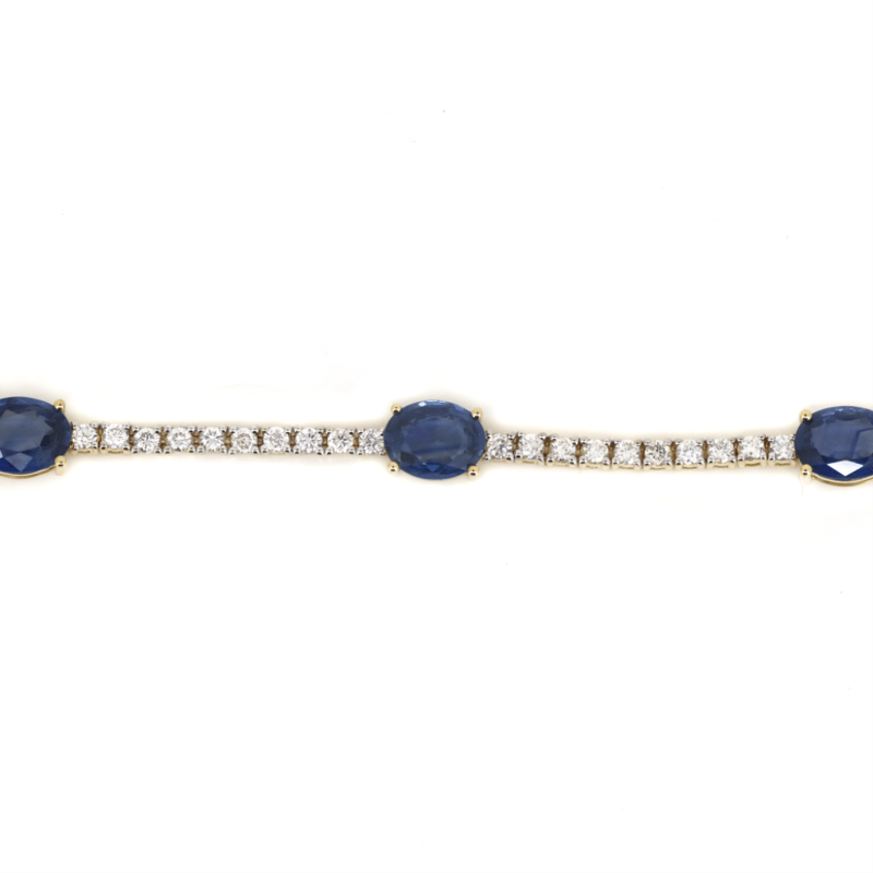 14K YELLOW GOLD, SAPPHIRE AND DIAMOND, LINE BRACELET. The Design Features, 5 Oval Cut, Sapphires (6.18Ct Tsw, Slightly Included), Claw Set. Alternating The Sapphires Are, 57 Round Brilliant Cut, Diamonds (1.76Ct Tdw, G-H Colour, Si1-Si2 Clarity), Claw Set. The Bracelet Has A Hidden Box Lock Closure With 2 Safety Clips. Bracelet Length Is 18Cm. Valuations Provided by an Independent Third-Party Professional Not Directly Associated With Lloyds Auctions at AUD $$46,000.00This valuation has been conducted by an independent third-party professional. The valuation amount is an assessment by the issuing valuer and does not reflect the auction value of the item. Any inquiries regarding the valuation should be directed to the issuing valuer (refer to contact details on the certificate), as Lloyds Auctions has no affiliation or influence over the valuation, the valuer, or the stated amount. Condition: Good - Refer Images 0+5340