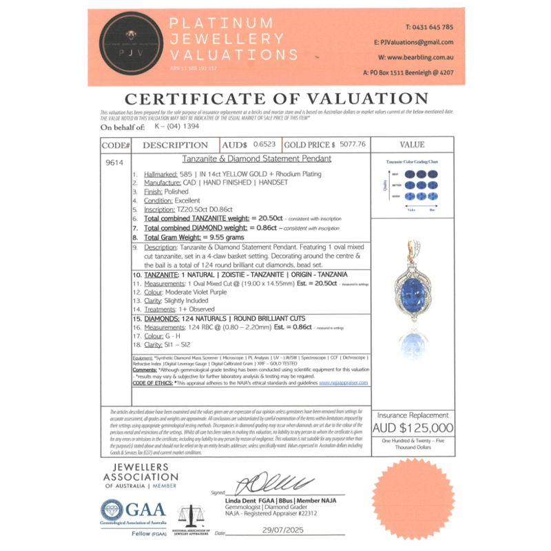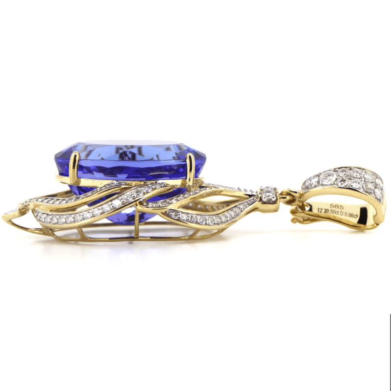 14K YELLOW GOLD, 20.50CT TANZANITE AND DIAMOND, STATEMENT PENDANT. The Centre Features, One Oval Mixed Cut, Moderate Violet Purple, Tanzanite (20.50Ct, Slightly Included), 4 Claw Set. Encompassing The Centre And Decorating The Bail Are, 124 Round Brilliant Cut, Diamonds (0.86Ct Tdw, G-H Colour, Si1-Si2 Clarity), Bead Set. Valuations Provided by an Independent Third-Party Professional Not Directly Associated With Lloyds Auctions at AUD $$125,000.00This valuation has been conducted by an independent third-party professional. The valuation amount is an assessment by the issuing valuer and does not reflect the auction value of the item. Any inquiries regarding the valuation should be directed to the issuing valuer (refer to contact details on the certificate), as Lloyds Auctions has no affiliation or influence over the valuation, the valuer, or the stated amount. Condition: Good - Refer Images 0+5343